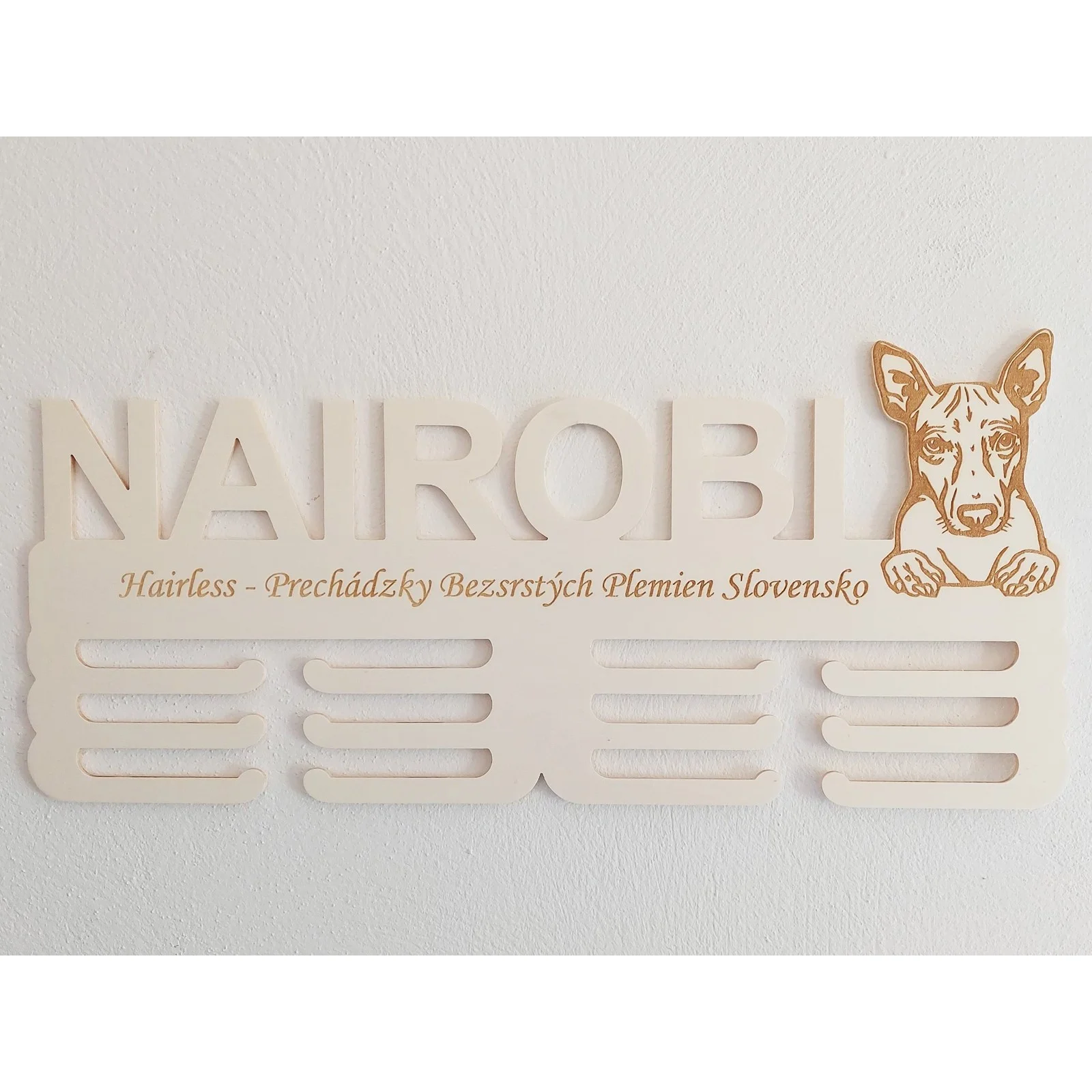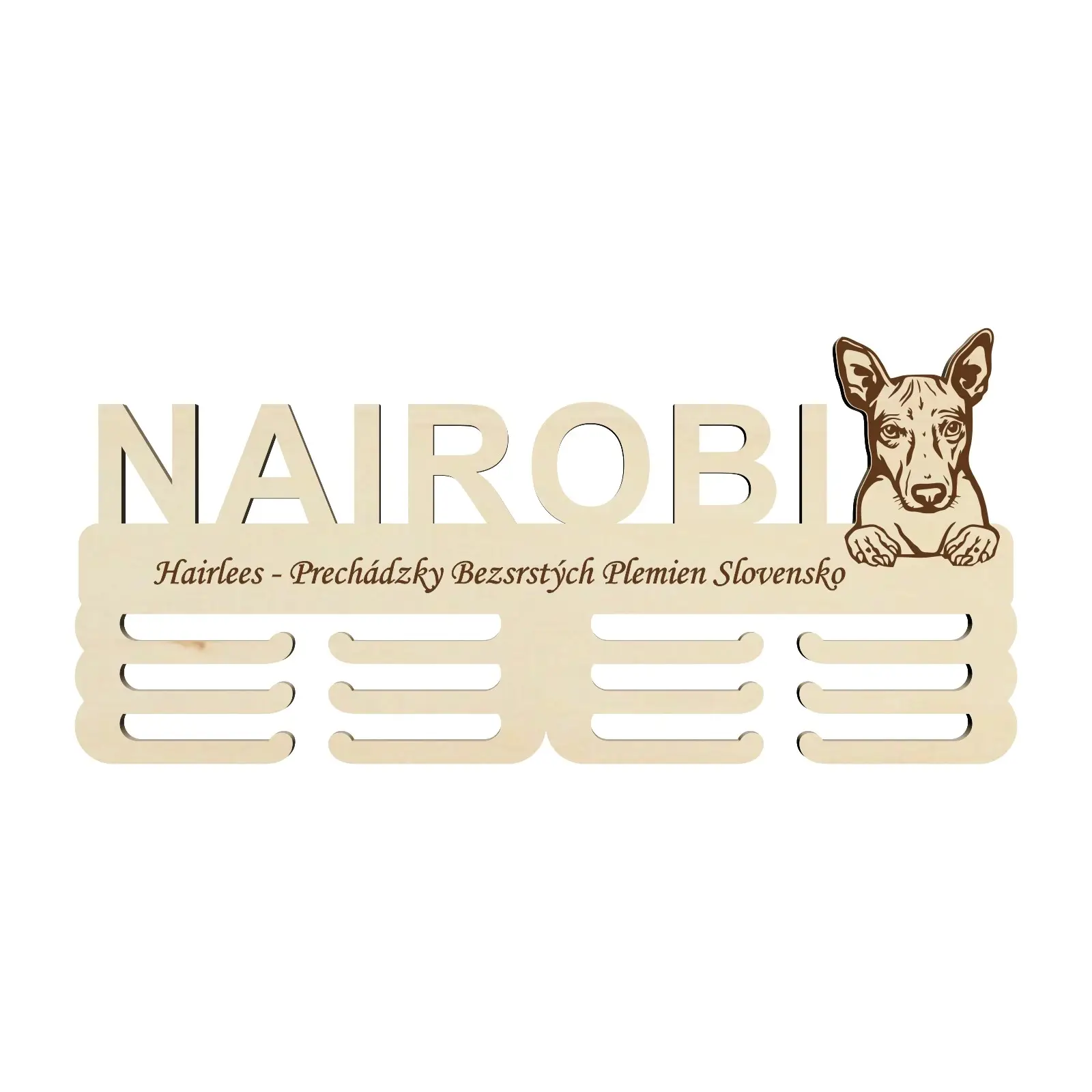 Drevený držiak na medaile s laserovaním 45cm plemeno Americký bezsrstý teriér