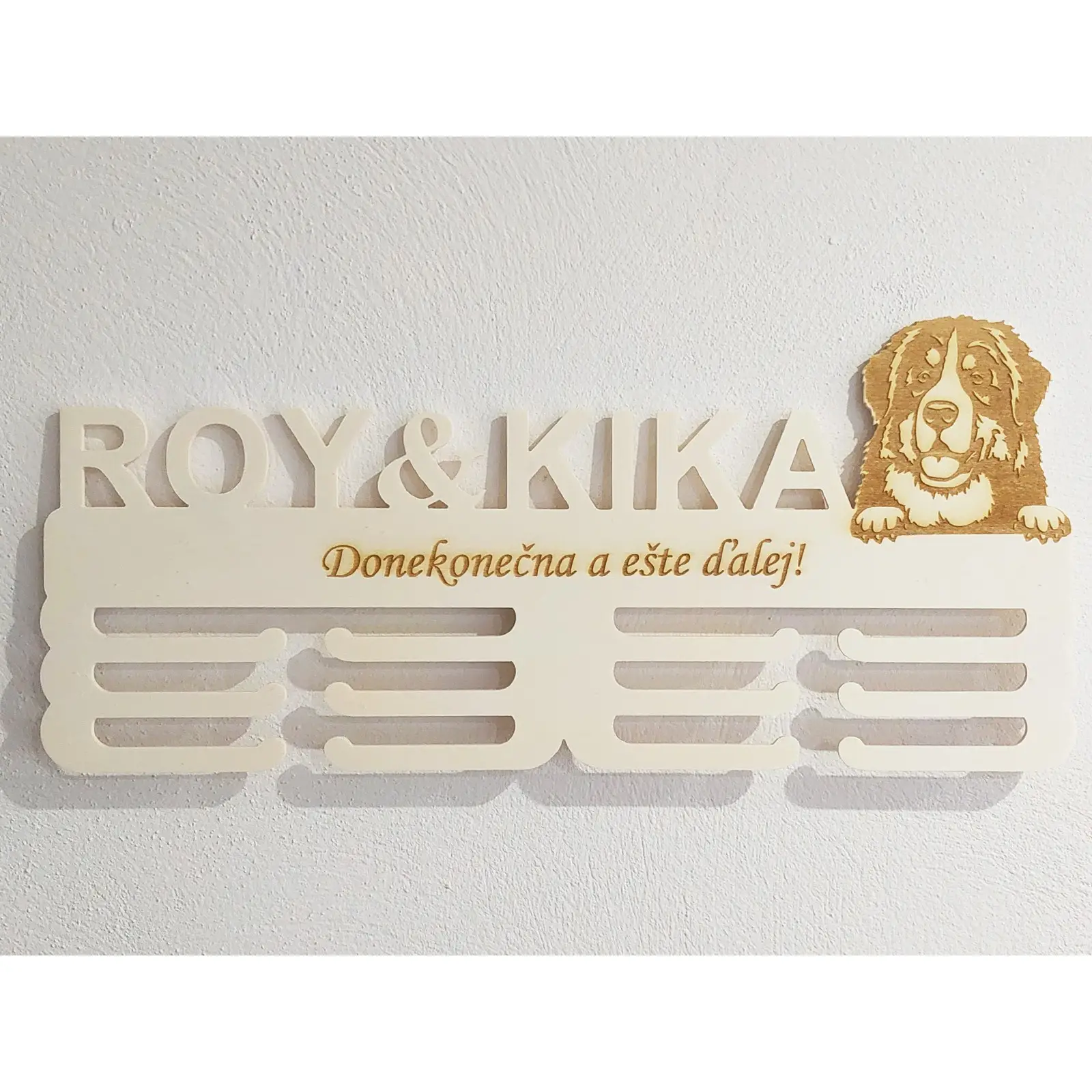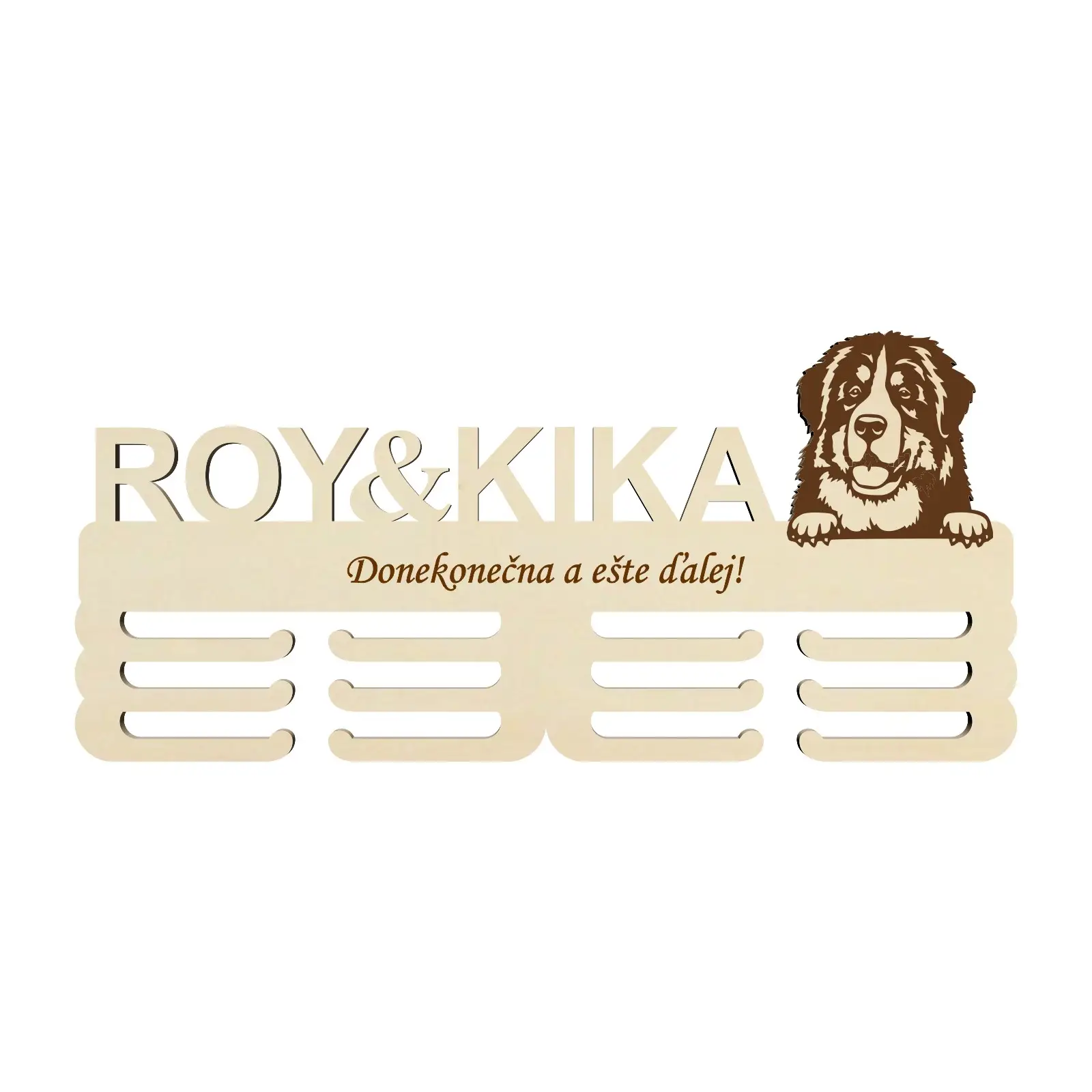 Už nikdy nechajte svoje cenné medaile ležať neusporiadané v zásuvke alebo skrývať sa v šatníku. Predstavujeme Vám exkluzívny drevený držiak na medaile s laserovaním, ktorý je nielen praktický, ale aj esteticky príťažlivý doplnok do každej domácnosti. Tento 45cm široký držiak je krásne ozdobený motívom psíka Bernského salašníckeho psa, čo dodáva celému produktu osobitý šarm a eleganciu.