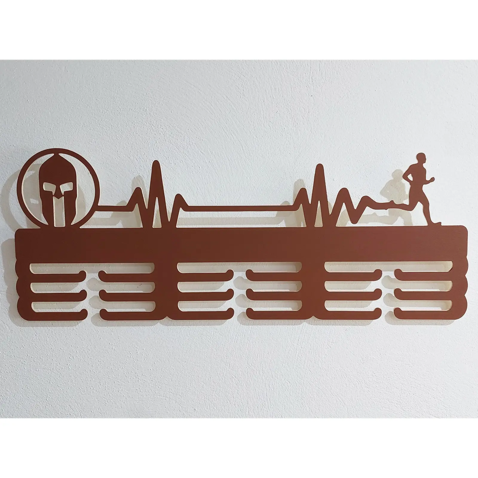 Ahojte bežci, spartanisti a všetci, ktorí milujete prekonávať svoje limity! Máme pre vás skvelú novinku, ktorá s hrdosťou vystaví vaše zaslúžené medaily a zároveň bude originálnym doplnkom vášho interiéru. Predstavujeme vám drevený vešiak na medaily s motívom Spartan a Beh, zdobený pulzom srdca.