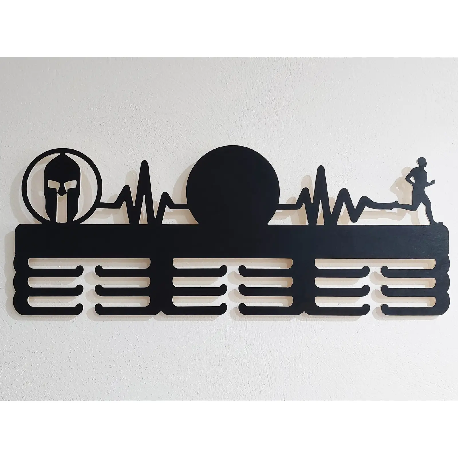 - Dizajn pre dve TRIFECTY: Tento vešiak bol navrhnutý s ohľadom na vašu vášeň pre Spartan Race a konkrétne pre zberateľov TRIFECTY. S dostatočnou šírkou 55 cm elegantne pojme dve kompletné sady medailí (Sprint, Super, Beast) a zároveň poskytne priestor aj pre prípadné ďalšie úspechy.