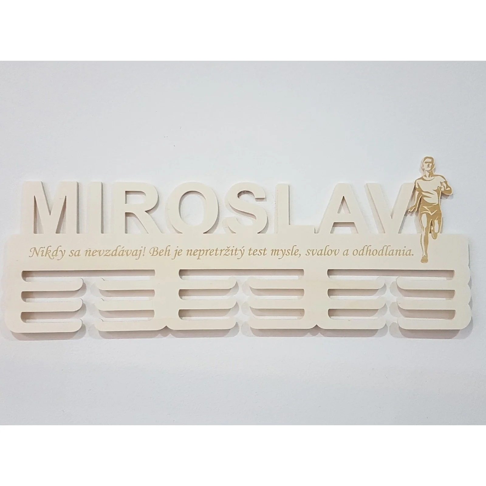Pre všetkých vášnivých atlétov, ktorí s hrdosťou zbierajú svoje zaslúžené medaily, máme skvelú novinku! Predstavujeme vám jedinečný vešiak na medaily s vaším menom a motivačným citátom, vyrobený z kvalitnej topoľovej preglejky. Tento štýlový a praktický doplnok bude nielen krásnou dekoráciou vášho interiéru, ale aj neustálou pripomienkou vašich atletických úspechov a odhodlania.