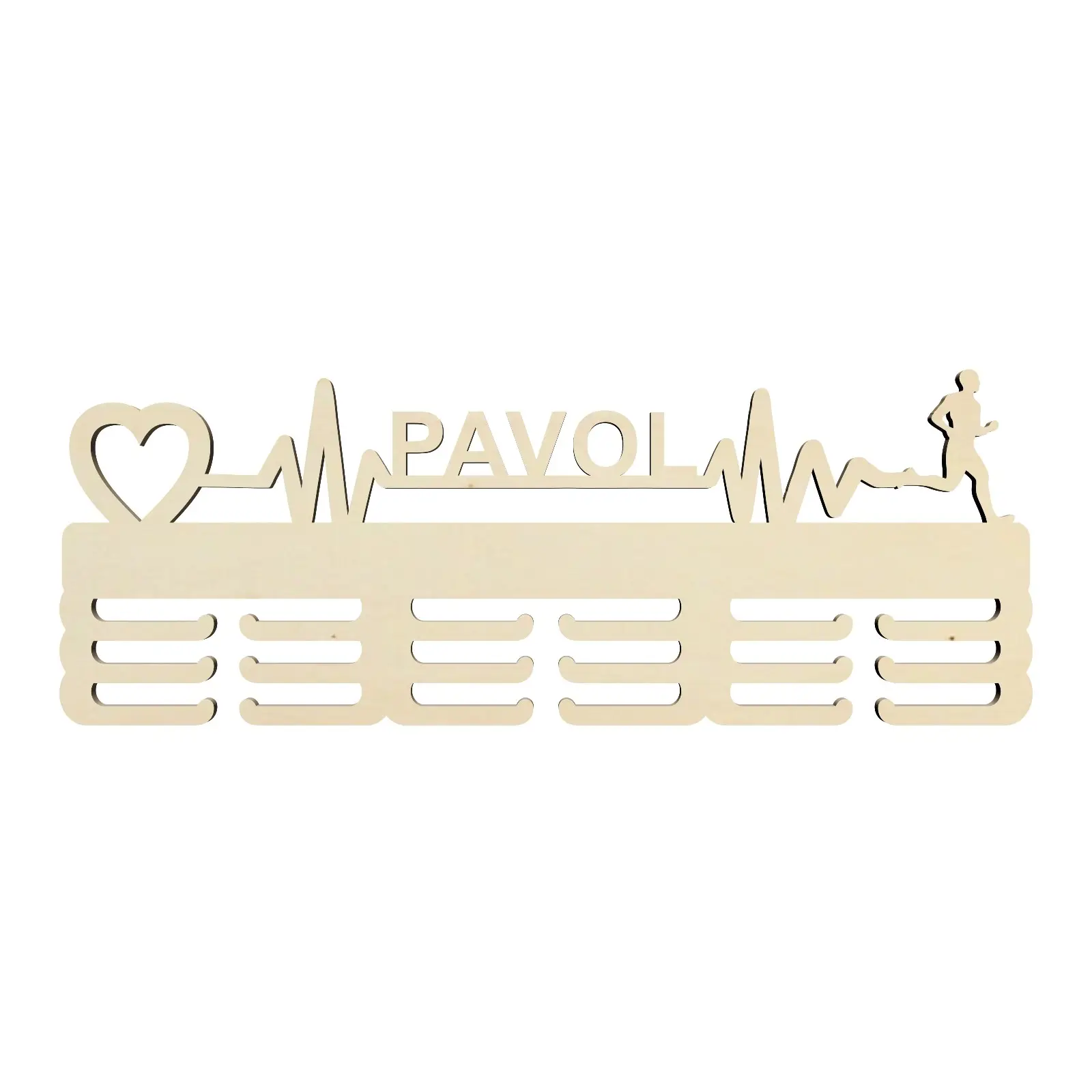 Ukážte svoje úspechy s dreveným vešiakom na medaily s menom, pulzom srdca a motívom behu!