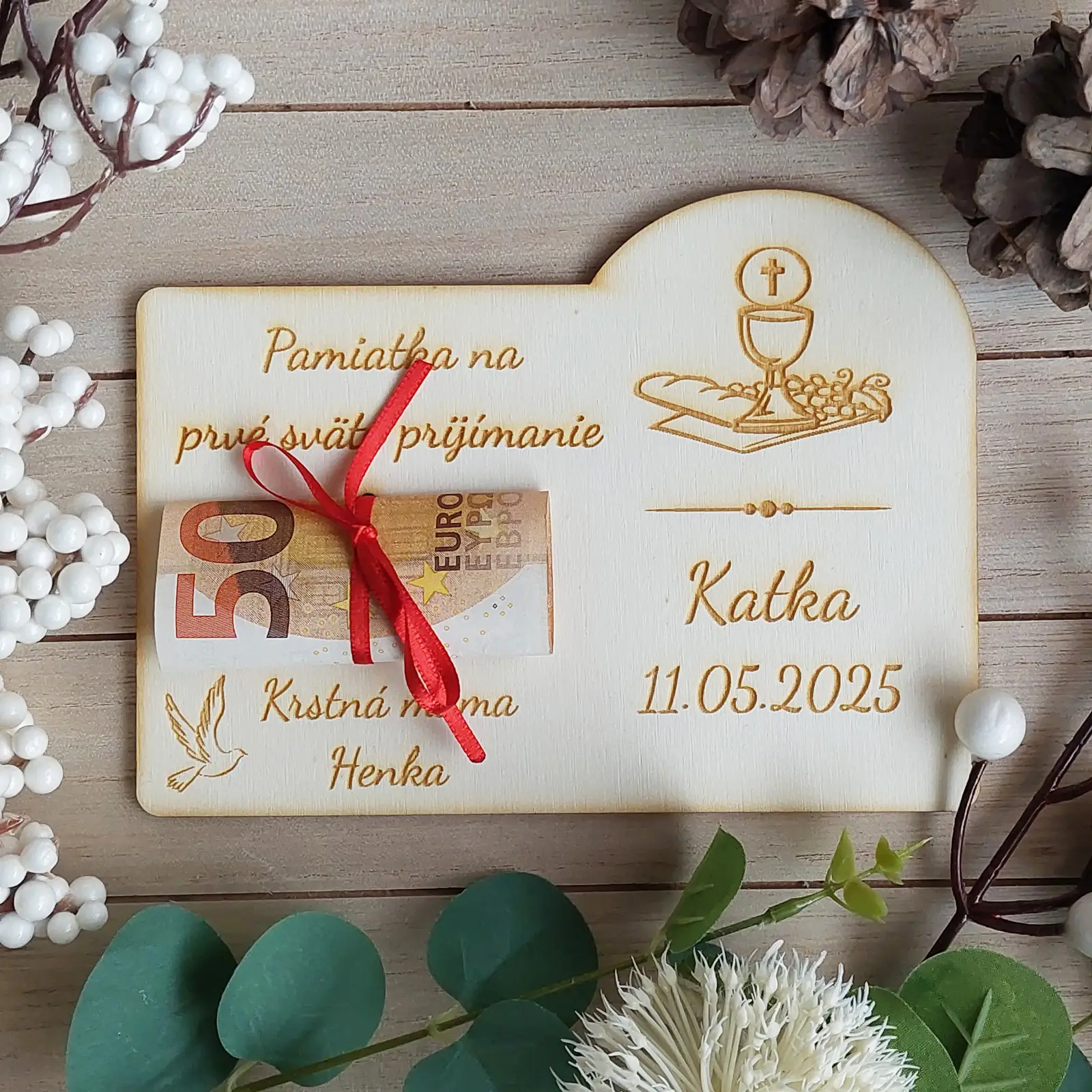 Drevená obálka na peniaze "Prvé sväté prijímanie" - Darček s dušou pre prvoprijímajúce deti