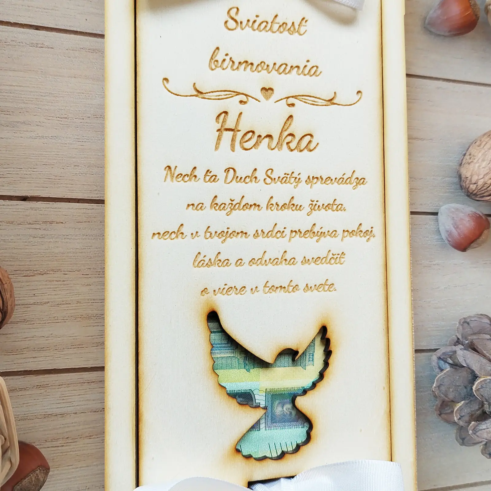 Hľadáte originálny a krásny darček pre dieťa, ktoré ide mať Sviatosť birmovania? Táto drevená obálka na peniaze je ideálnou voľbou!