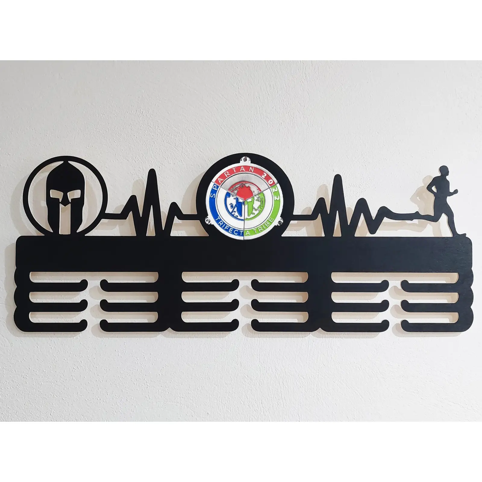 Der hölzerne Medaillenhaken mit einer Höhe von 55 cm ist bemalt mit SPARTAN PULZ RUN