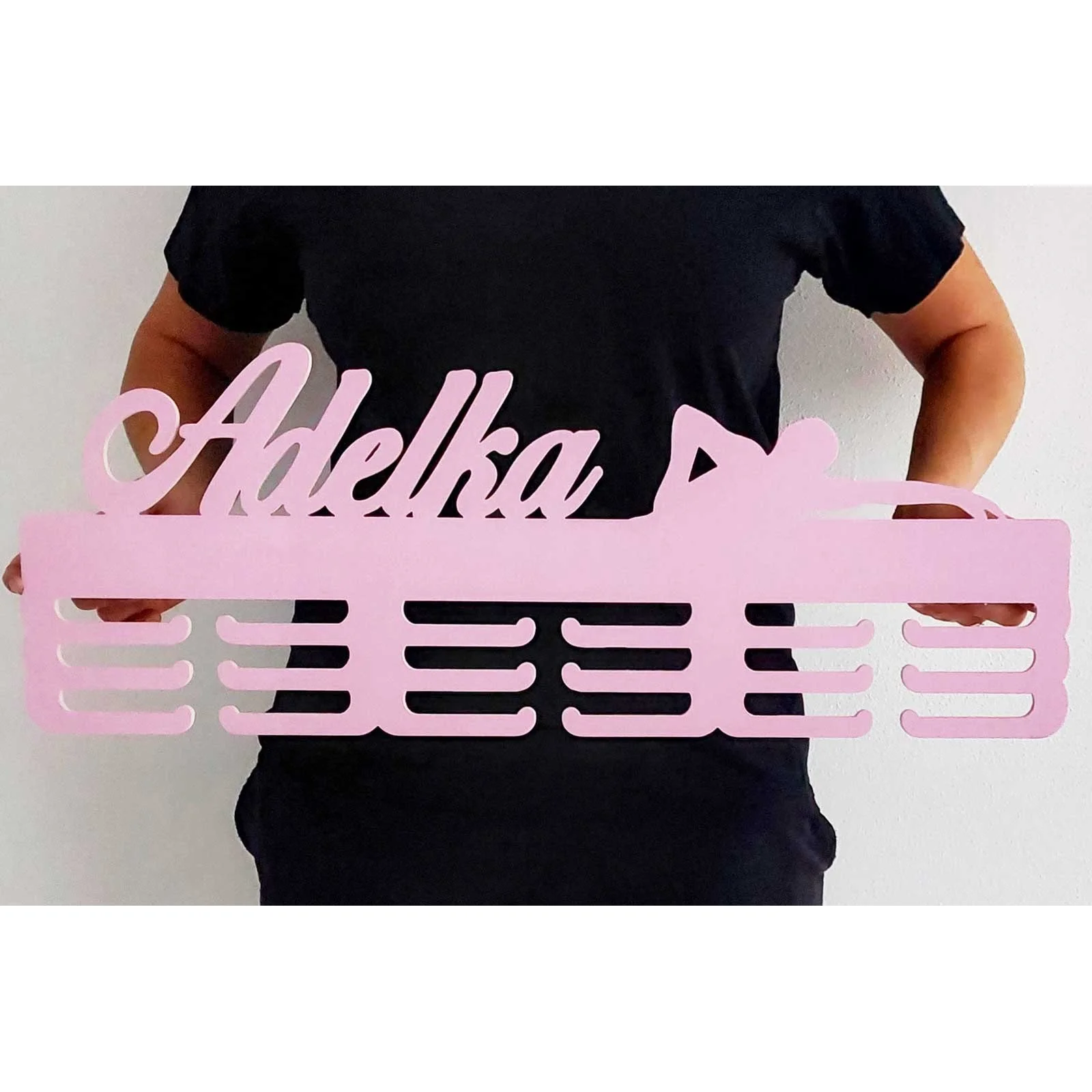 Tolle Wahl! Der bemalte hölzerne Medaillenständer mit einer Breite von 65 cm mit der Personalisierung des Namens und des Sports ist nicht nur praktisch, sondern auch eine schöne Dekoration, die Ihre Erfolge hervorhebt.
