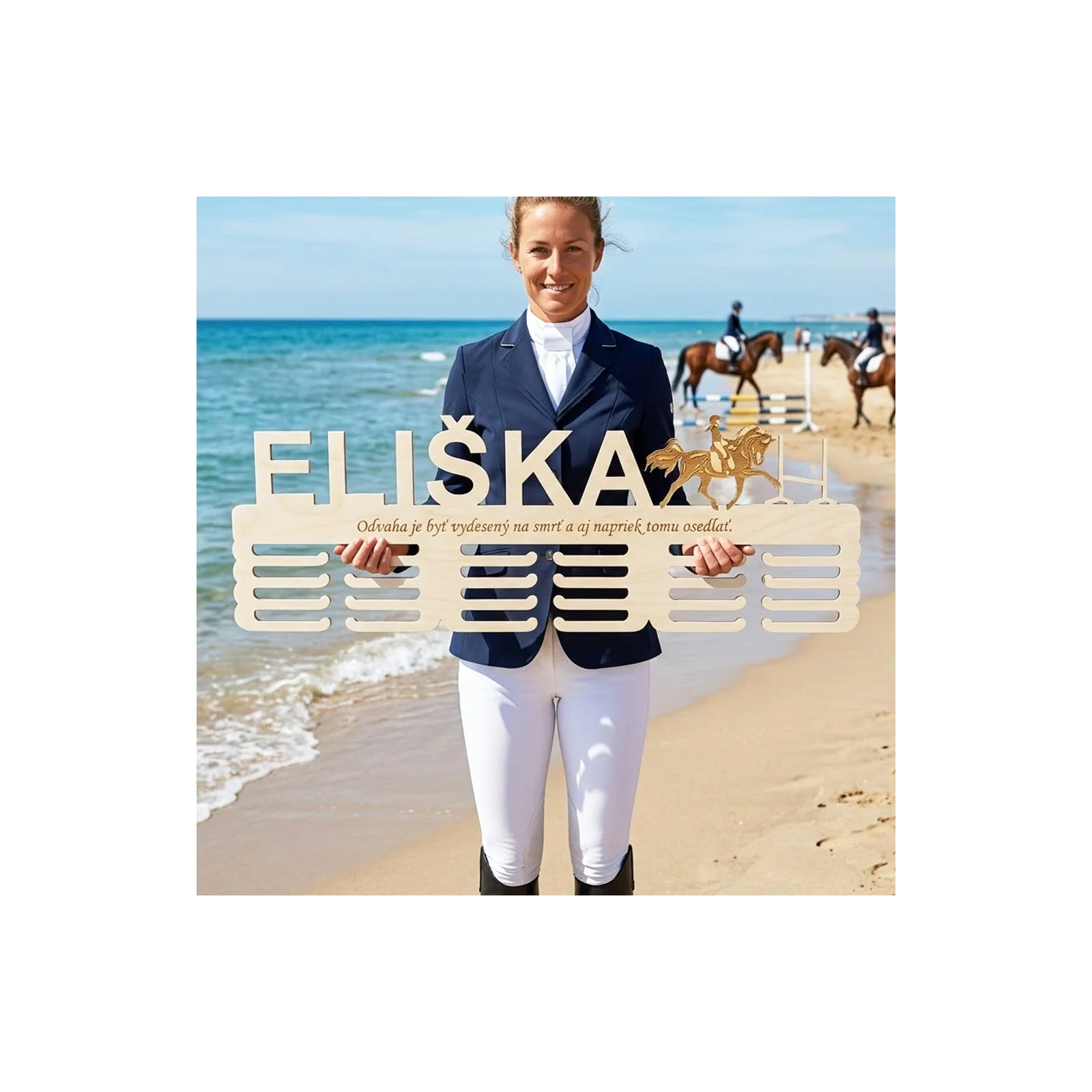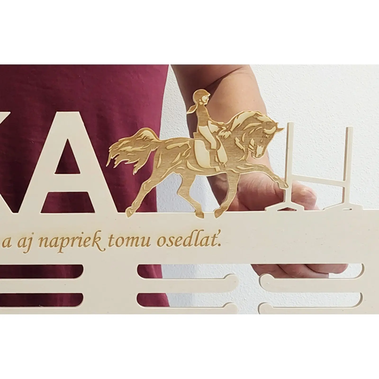 Der hölzerne Held der Mauern: Medaillenhaken für leidenschaftliche Parkour-Reiter Jede Medaille hat ihre eigene Geschichte. Jede spiegelt Stunden des Trainings, überwundene Hindernisse, die Stärke des Willens und unvergessliche Momente im Sattel wider. Wenn Sie zu den leidenschaftlichen Parkour-Reitern gehören, wissen Sie sicherlich, wovon ich spreche. Und genau für Sie, für diejenigen, die für Sprünge und elegante Durchgänge leben, haben wir etwas Besonderes! Stellen Sie sich vor, Sie kommen nach einem anstrengenden Training oder erfolgreichen Rennen nach Hause. Schon beim Betreten des Zimmers fällt Ihr Blick auf einen schönen, 80 cm langen hölzernen Haken, der stolz Ihre verdienten Medaillen trägt. Es ist nicht nur ein einfacher Haken - es ist ein persönliches Stück, das von Ihrer Leidenschaft und Ihren Erfolgen spricht. Warum gerade ein hölzerner Medaillenhaken mit Namen und Motiv des Parkour-Reitens? - Feier Ihrer Identität: Dieser Haken ist mehr als nur ein praktisches Zubehör. Es ist eine Darstellung dessen, wer Sie sind - ein begeisterter Parkour-Reiter. Ihr Name, elegant aus Pappel-Sperrholz geschnitzt, verleiht dem Haken einen persönlichen und einzigartigen Charakter. - Stilvolles Design: Naturholz in Kombination mit einem Motiv des Parkour-Reitens (zum Beispiel die Silhouette eines Pferdes, das ein Hindernis überwindet) schafft an Ihrer Wand ein fesselndes und geschmackvolles Detail. Egal, ob Sie ihn im Kinderzimmer, Wohnzimmer oder in der Nähe Ihrer Reitausrüstung platzieren, er wird immer Aufmerksamkeit erregen. - Praktikabilität und Übersichtlichkeit: Keine herumliegenden Medaillen in Schachteln mehr! Dieser Haken ermöglicht es Ihnen, alle Ihre Erfolge stolz an einem Ort auszustellen. Dank der Länge von 80 cm passen genug Medaillen darauf und sie sind übersichtlich angeordnet. - Perfektes Geschenk: Suchen Sie ein originelles und persönliches Geschenk für Ihren nahestehenden Menschen, der Parkour-Reiten liebt? Der hölzerne Medaillenhaken mit Namen ist ein Geschenk, das eine Seele hat und den Beschenkten ständig erfreuen und motivieren wird. Maße: Breite 80 cm x Höhe variabel je nach Längen des Namens + Lasergravur. Dicke 6 mm natürliches Sperrholz. Ich biete nur die unbemalte Variante des Hakens an, wenn Sie ihn zu Hause bemalen möchten, eignen sich am besten Acrylfarben. Die Produkte sind aus Holz-Sperrholz gefertigt und tragen daher die Merkmale und die Struktur des Holzes.