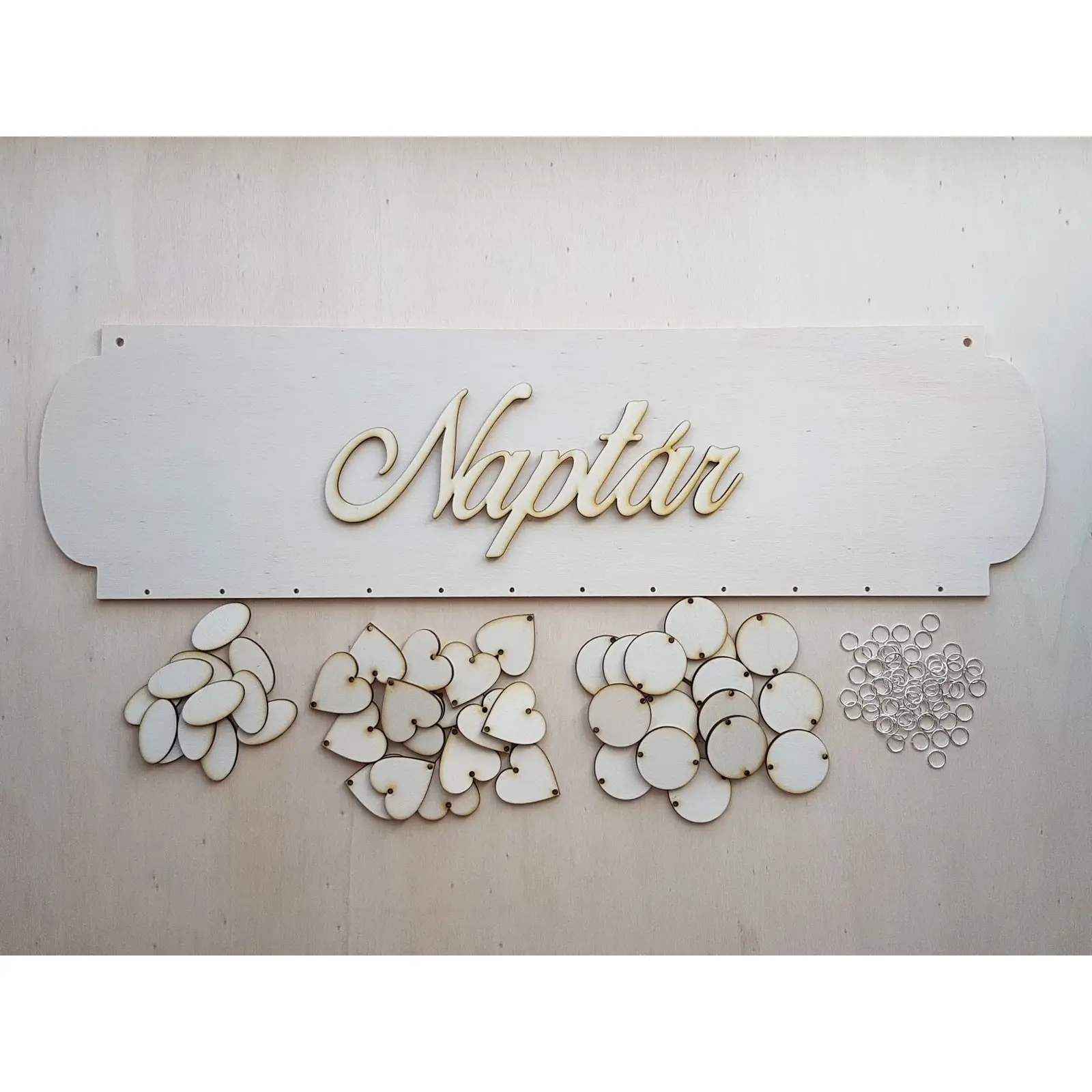 Inhalt eines Pakets: 1x 3D-Schriftzug (nicht geklebt), 1x Tafel, 18x Herzchen, 18x Kreise, 12x Ovale, 60x Ringe zum Verbinden (10 mm).