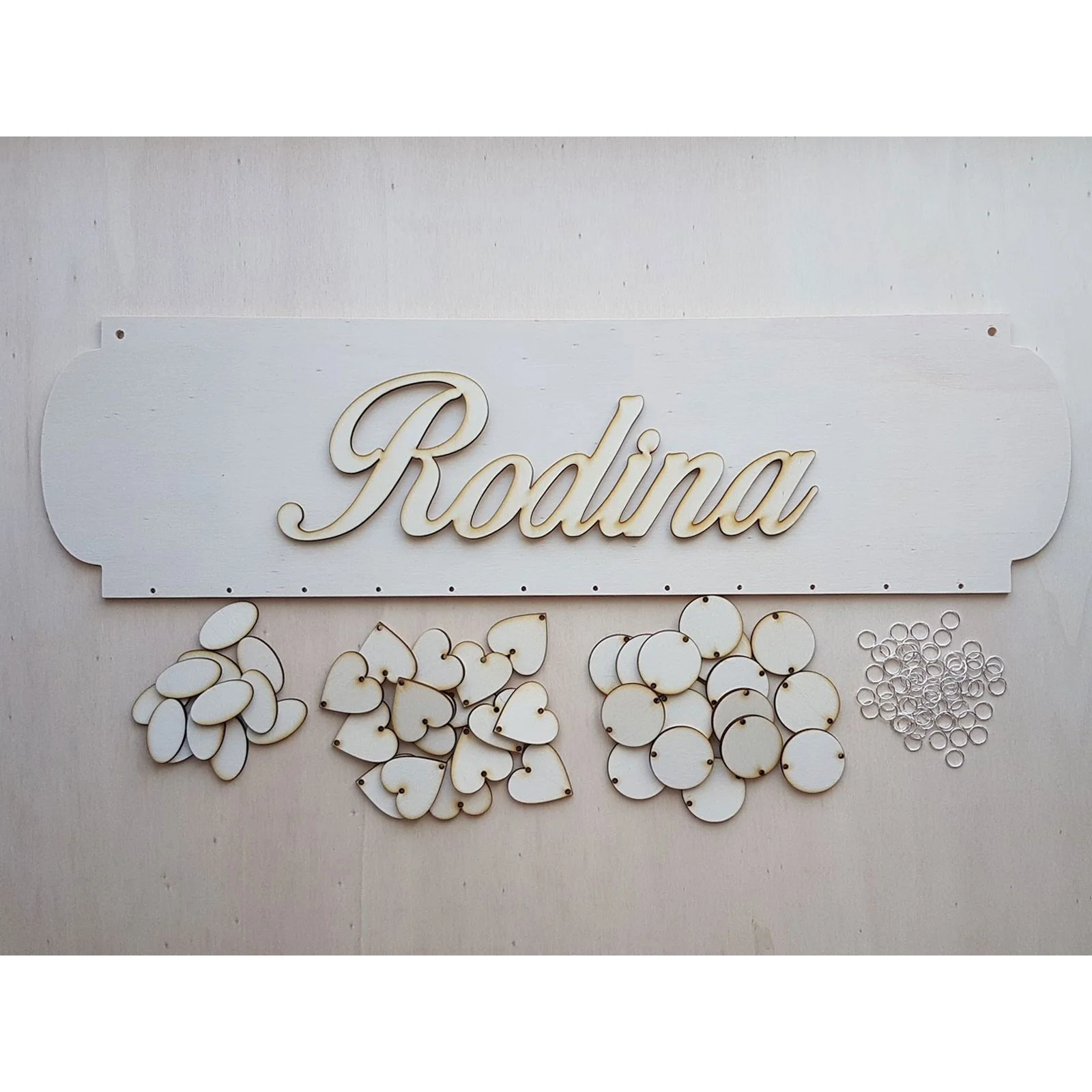 Inhalt eines Pakets: 1x 3D-Schriftzug (nicht verklebt), 1x Tafel, 18x Herzchen, 18x Kreise, 12x Oval, 60x Ring zur Verbindung (10 mm).