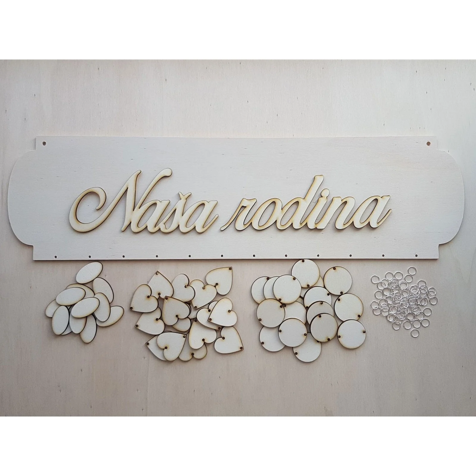 Inhalt eines Pakets: 1x 3D-Schriftzug (nicht aufgeklebt), 1x Tafel, 18x Herz, 18x Kreis, 12x Oval, 60x Ring zur Verbindung (10 mm).