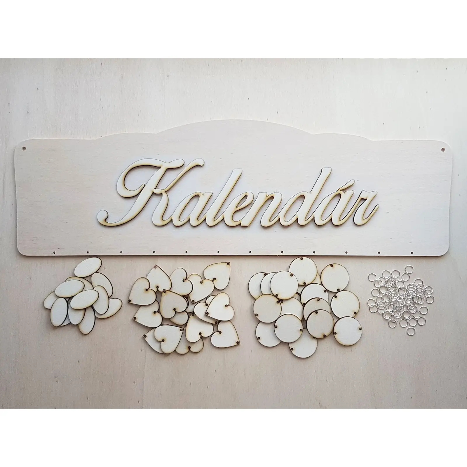 Inhalt eines Pakets: 1x 3D-Schriftzug (nicht aufgeklebt), 1x Tafel, 18x Herzchen, 18x Kreise, 12x Ovale, 60x Ringe zum Verbinden (10 mm).