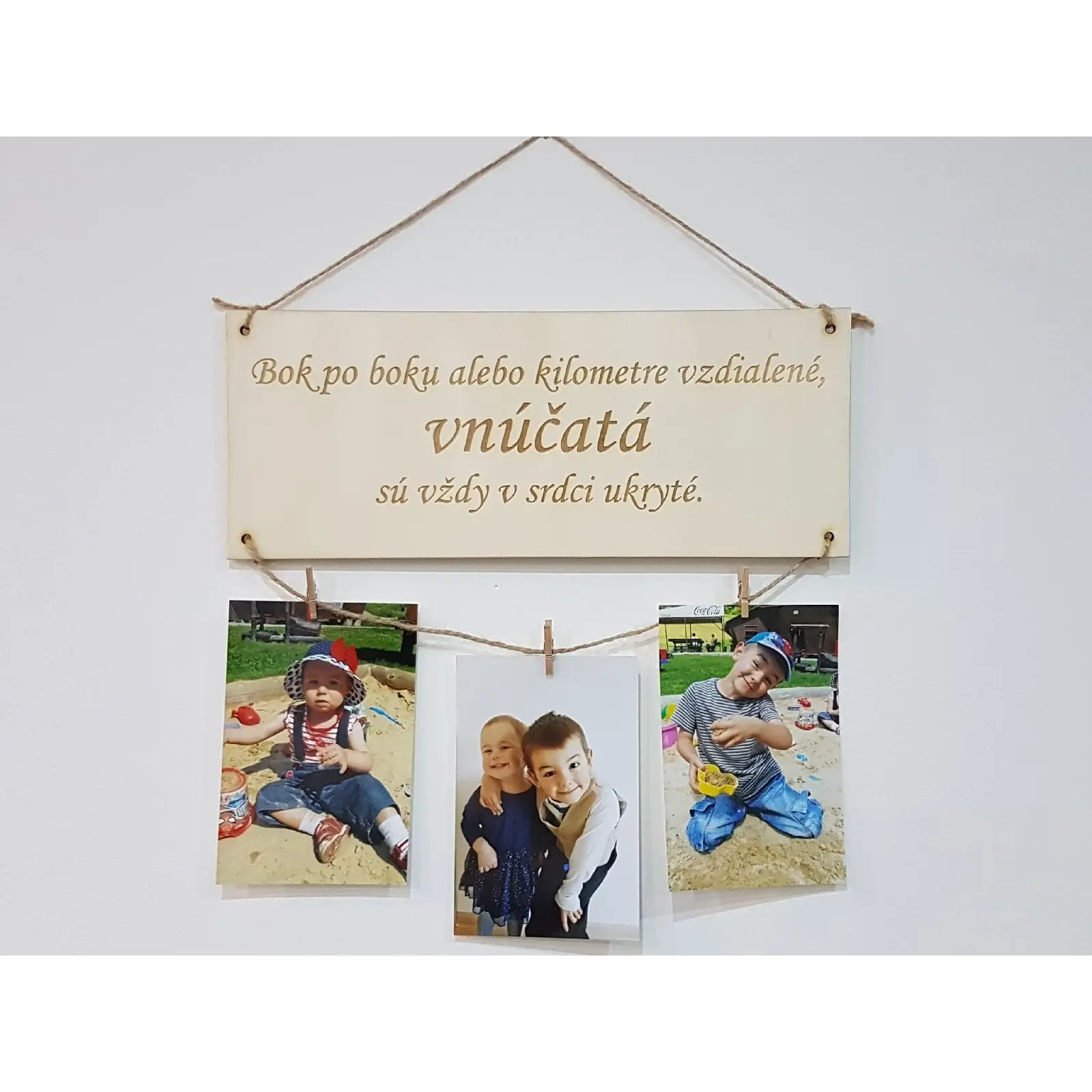 Im Lieferumfang enthalten: Tafel mit Zitat, Klammern und Schnur.