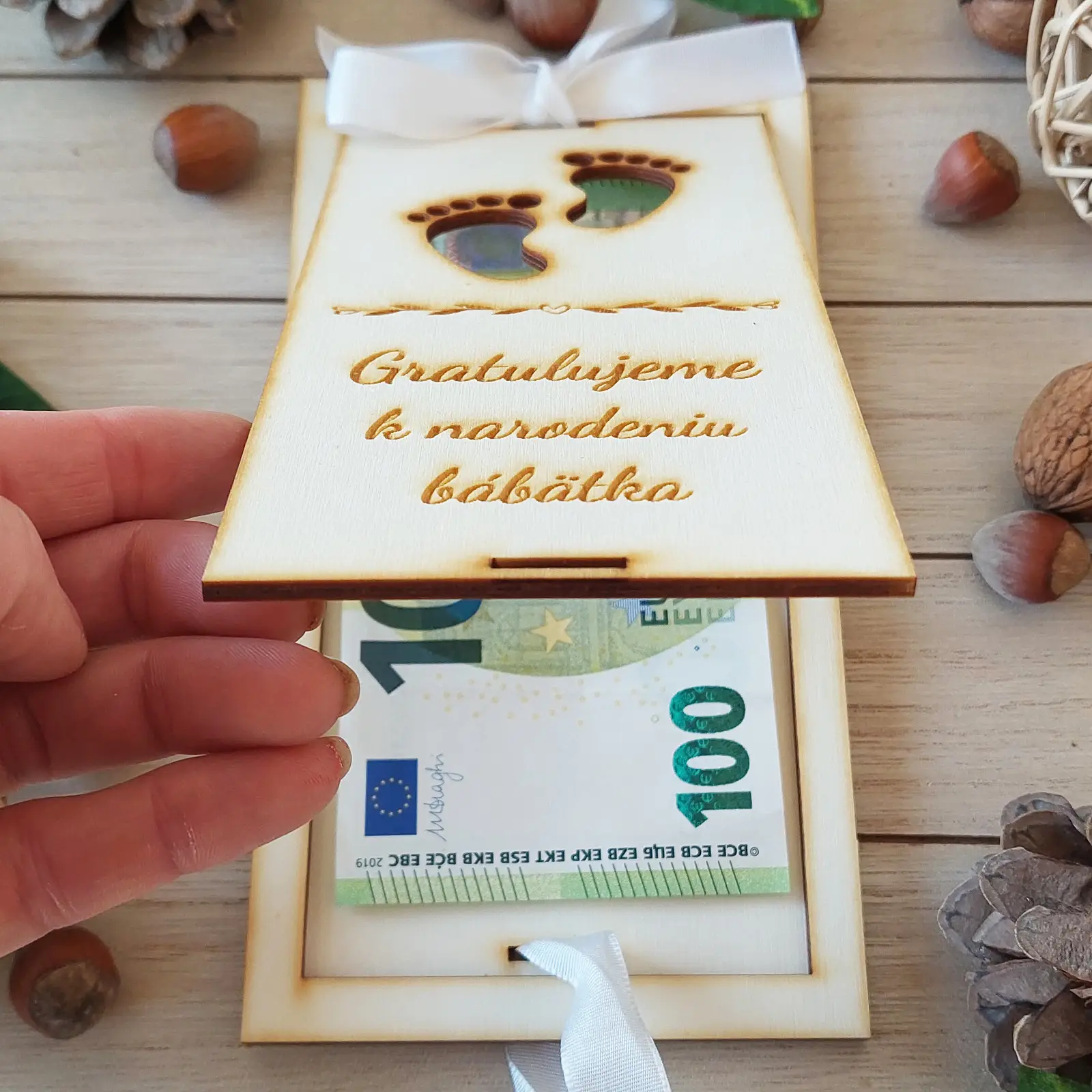 Suchen Sie ein originelles und schönes Geschenk für frischgebackene Eltern? Dieser Holzumschlag für Geld ist die ideale Wahl! Er besteht aus hochwertigem Holz und hat die Maße 20x10cm, sodass Geld oder ein Geschenkgutschein bequem Platz finden.