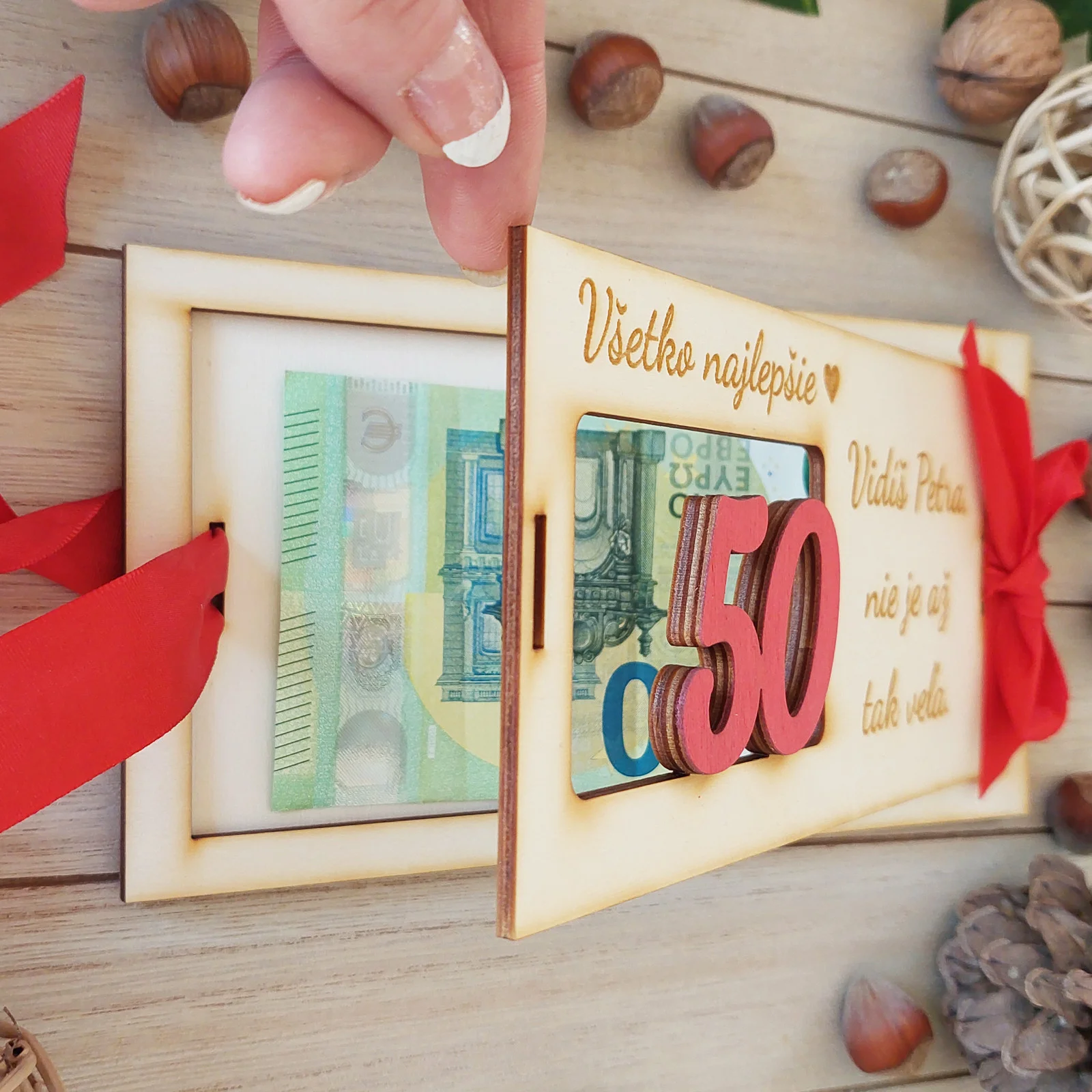 Ein Holzumschlag für Geld, 20 x 10 cm. Sie sehen, 50 ist gar nicht so viel.