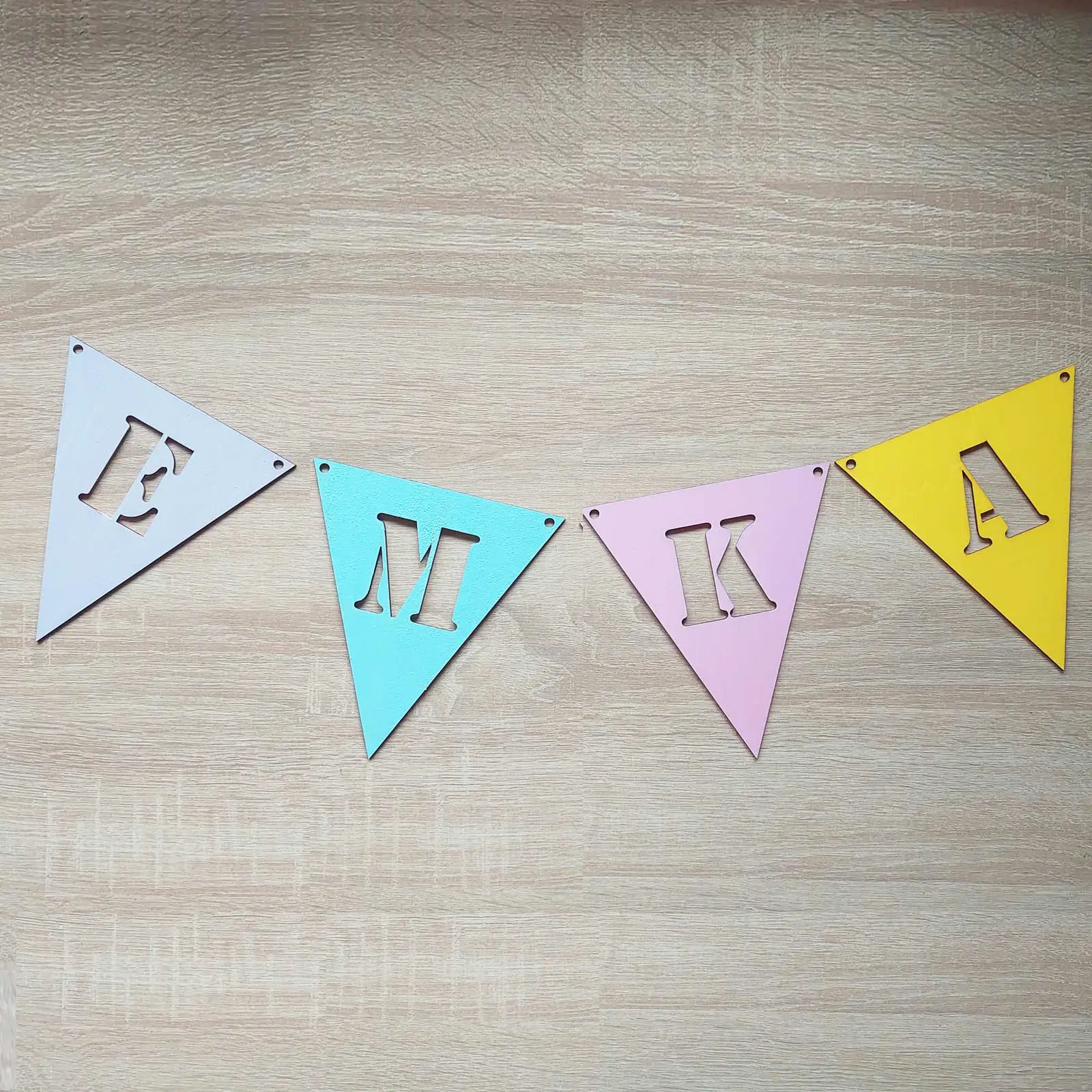 Holzgirlanden aus Sperrholz: Buchstaben sind ausgeschnitten.