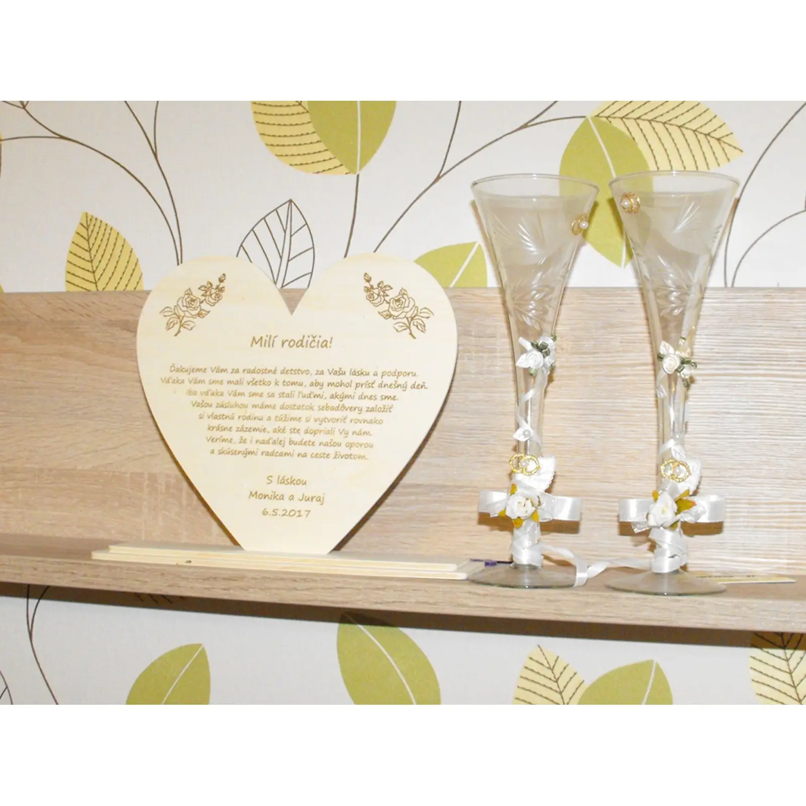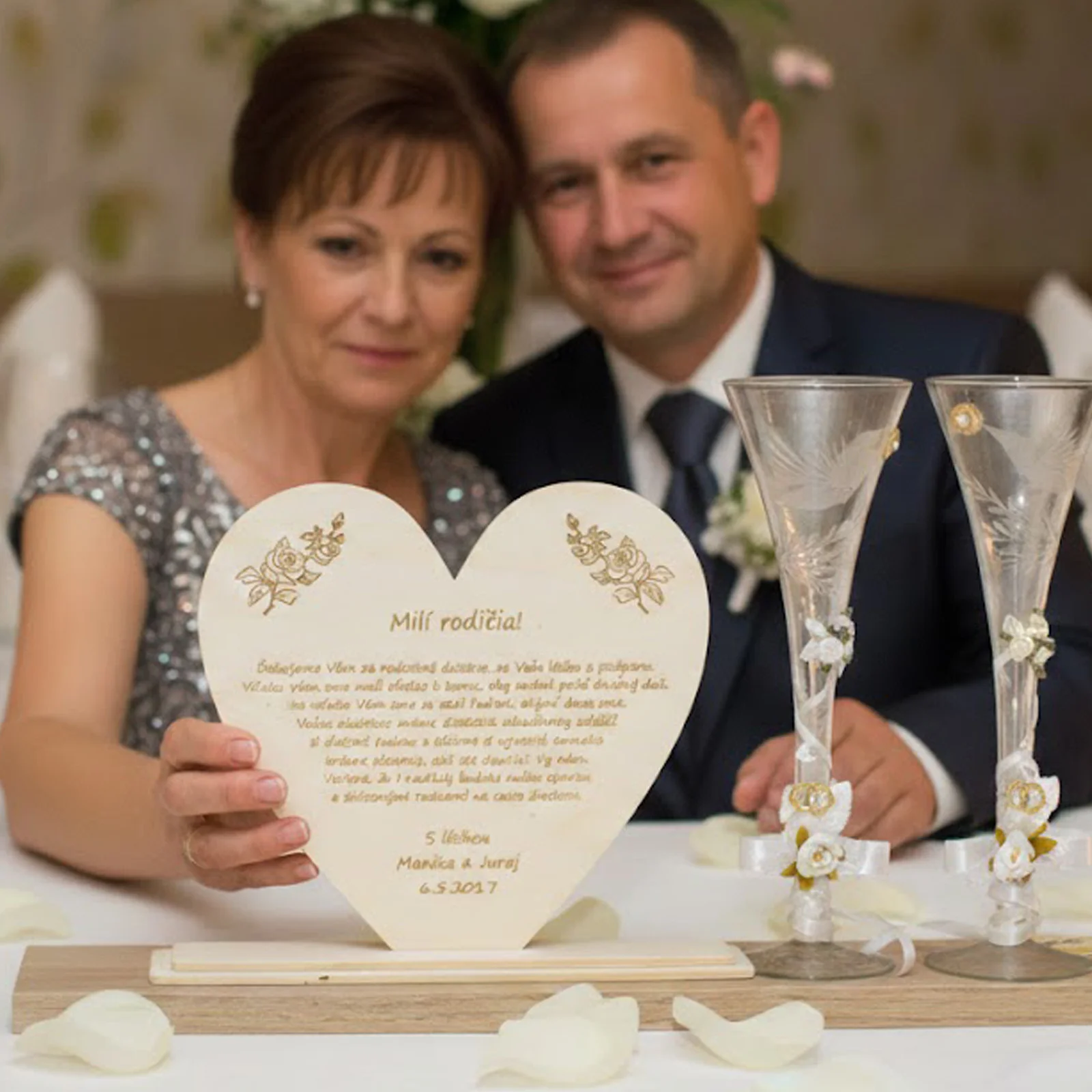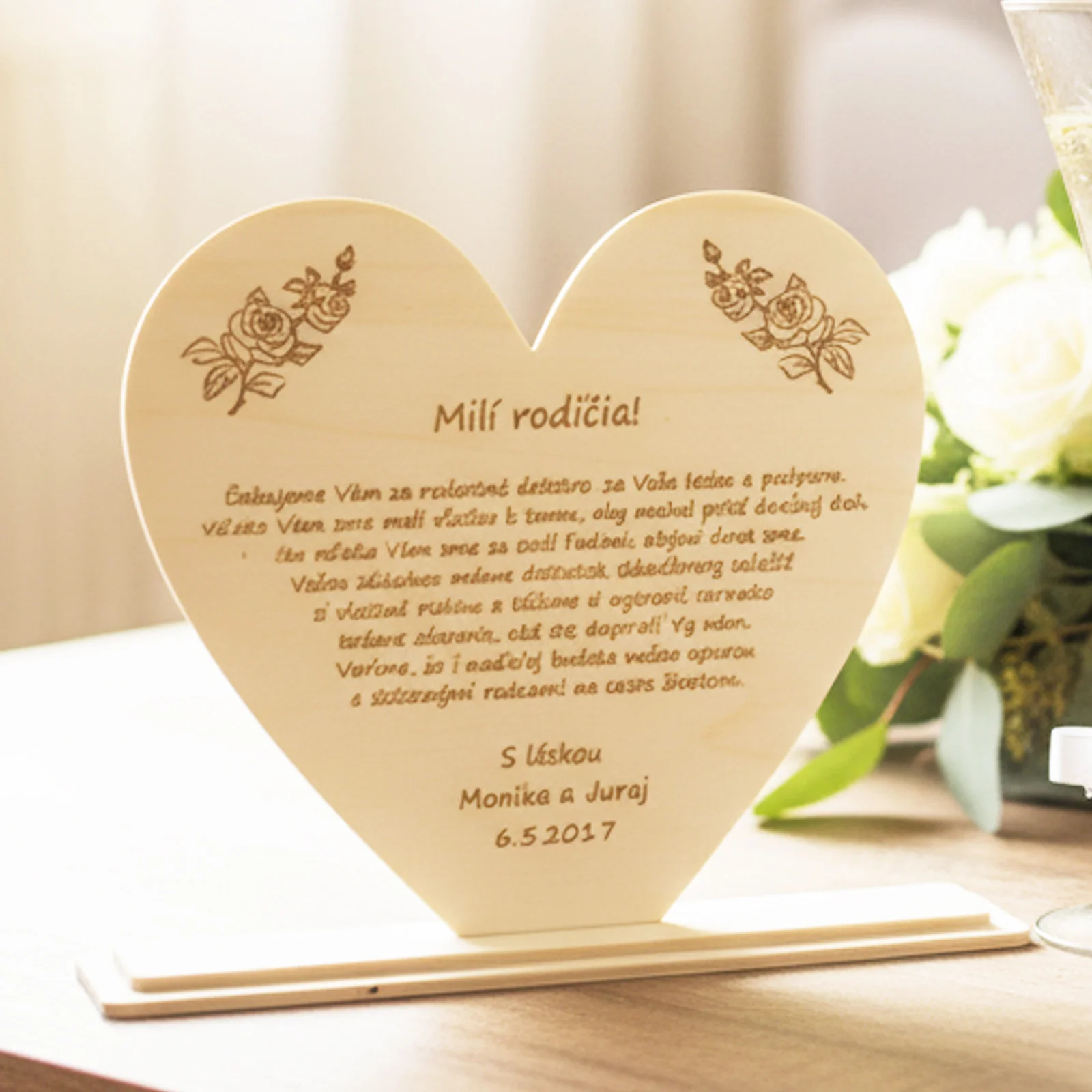 Originale Dank an Eltern: Herz voller Dankbarkeit Sie suchen nach einem Weg, um Ihren Eltern für ihre unendliche Liebe und Unterstützung Dankbarkeit zu zeigen? Möchten Sie ihnen etwas schenken, das nicht nur schön, sondern auch haltbar ist? Ein originelles Dankeschön an die Eltern in Herzform mit den Maßen 22,5x20,5 cm ist die ideale Lösung. Dieses dekorative Stück vereint Ästhetik und tiefes Empfinden und schafft somit ein einzigartiges Geschenk, das Ihre Eltern für immer schätzen werden. Warum gerade ein Herz? Das Herz ist ein universelles Symbol der Liebe und Dankbarkeit. Seine Form drückt tiefe Gefühle und Respekt aus, die Sie Ihren Eltern entgegenbringen. Dieses symbolische Geschenk wird sie daran erinnern, wie wichtig sie für Sie sind und wie sehr Sie alles schätzen, was sie für Sie getan haben. Ein Herz, das den Eltern zum Gedenken und als Dankbarkeit am Hochzeitstag gewidmet ist. Kann auch als Glückwunsch zum Festtag, Liebeserklärung und Ähnliches angepasst werden. Aus 4 mm Sperrholz ausgeschnitten, Text und Aufschrift gelasert. Höhe 22 cm und Breite 20,5 cm mit Unterlage.