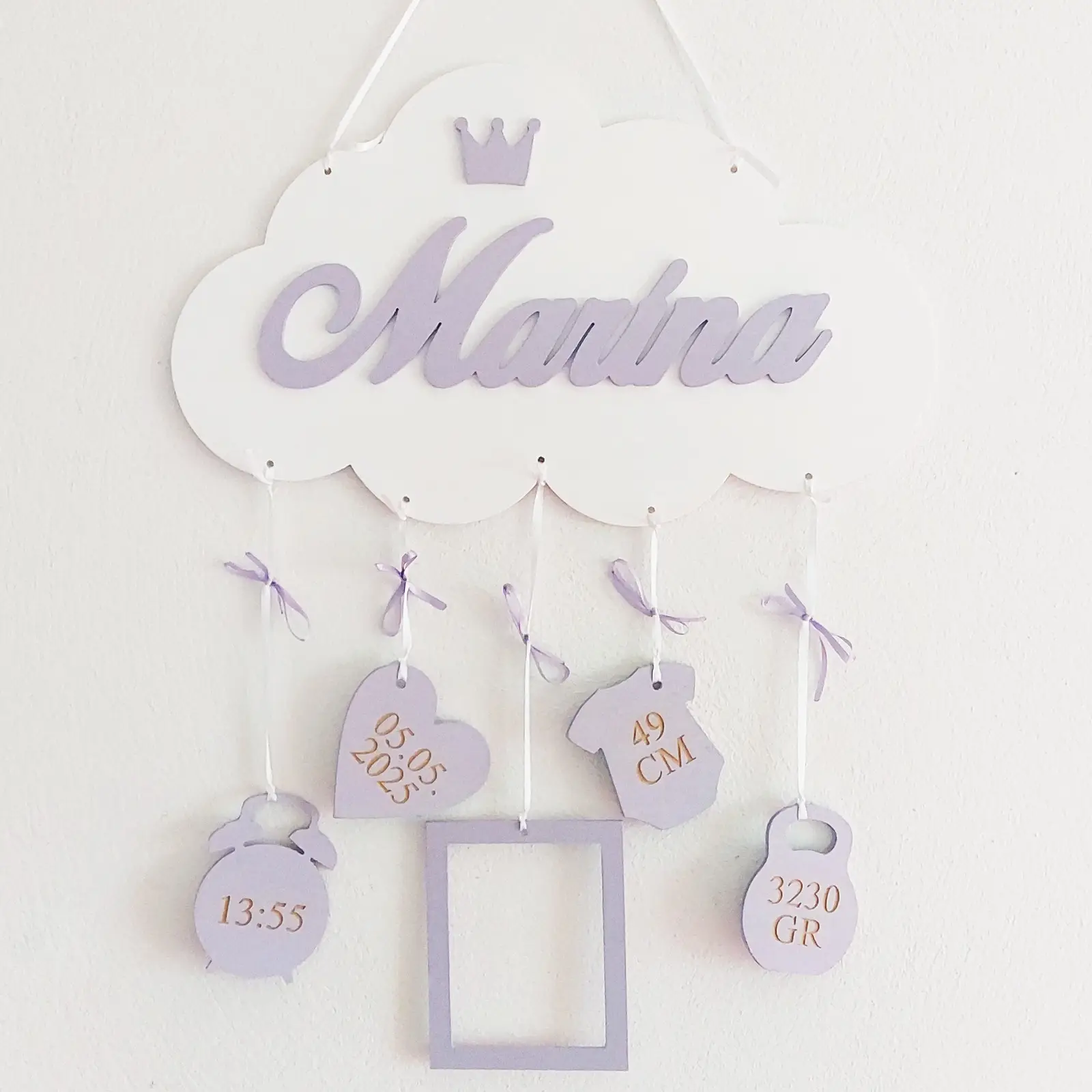 Es handelt sich um eine handgemalte Wolke mit einem Durchmesser von ca. 35 cm, die mit dem Namen und dem Geburtsdatum des Kindes verziert ist. Oft werden noch weitere nette Details hinzugefügt, wie etwa Geburtszeit und Geburtsgewicht.