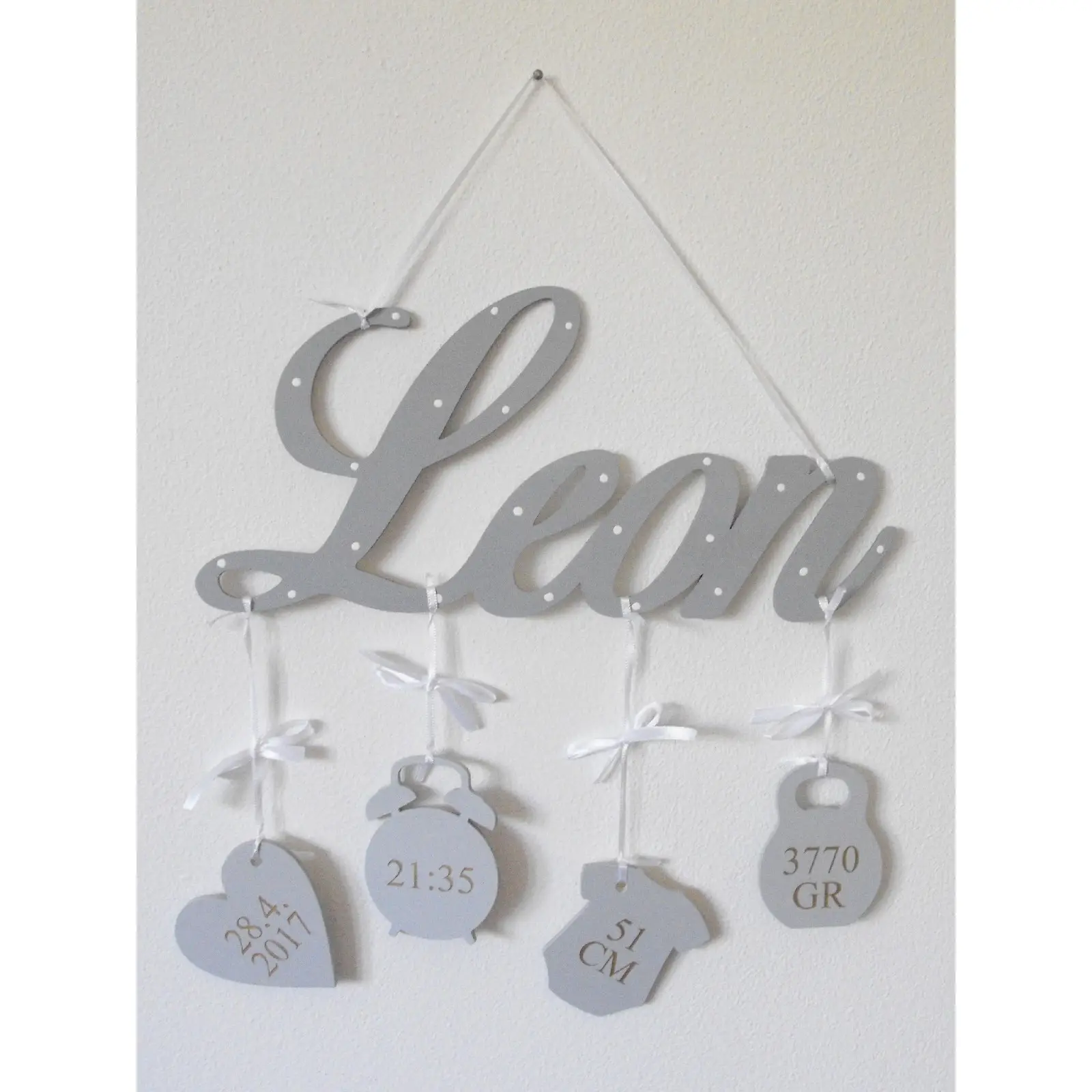 Auf Maß gefertigter Name des Kindes mit angehängten Angaben zur Geburt: Datum - Uhrzeit - Länge - Gewicht.
