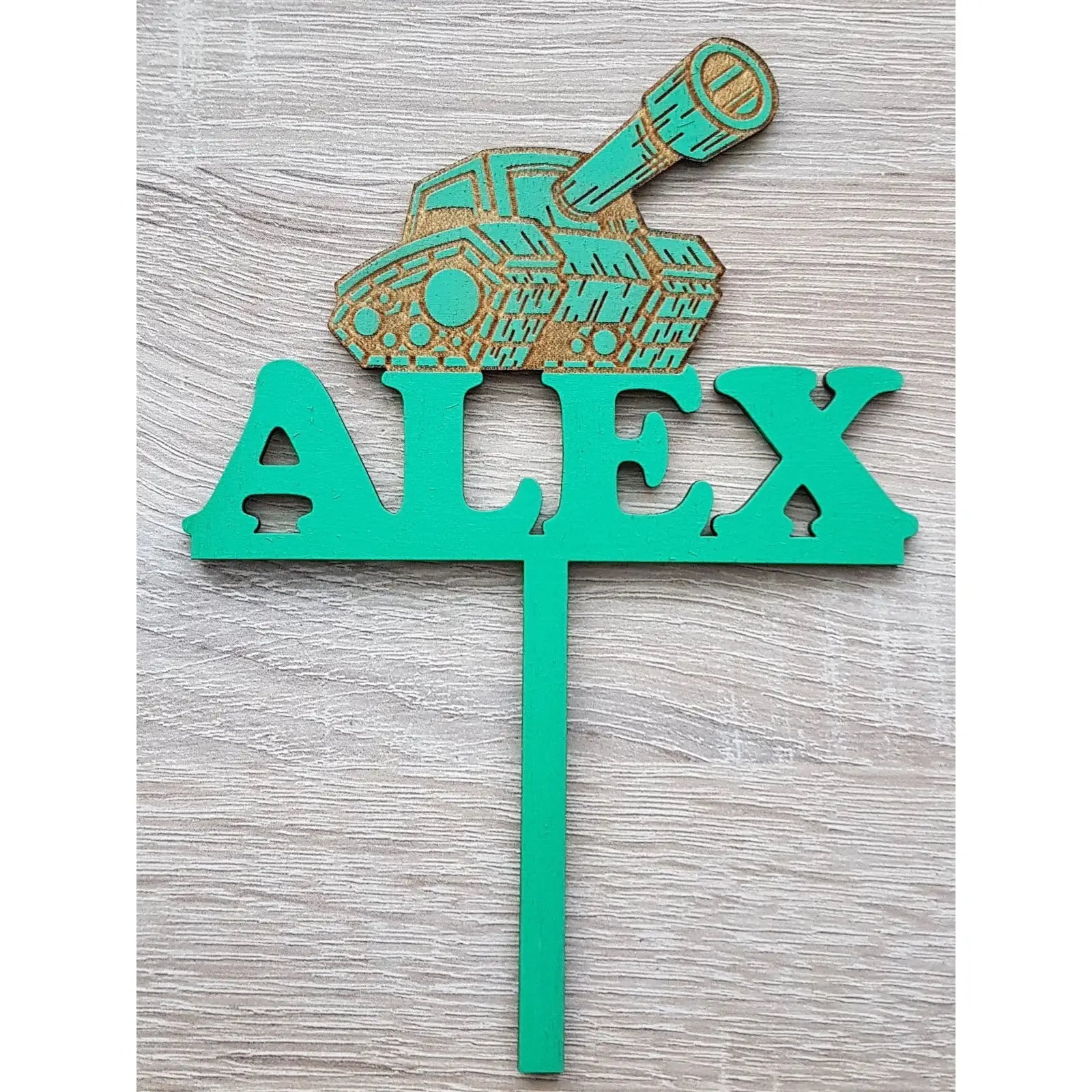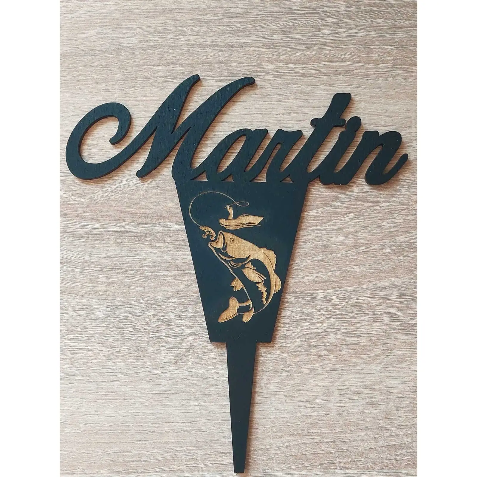 Maßgefertigter hölzerner Pflock mit Name, Alter und Text Breite 14cm