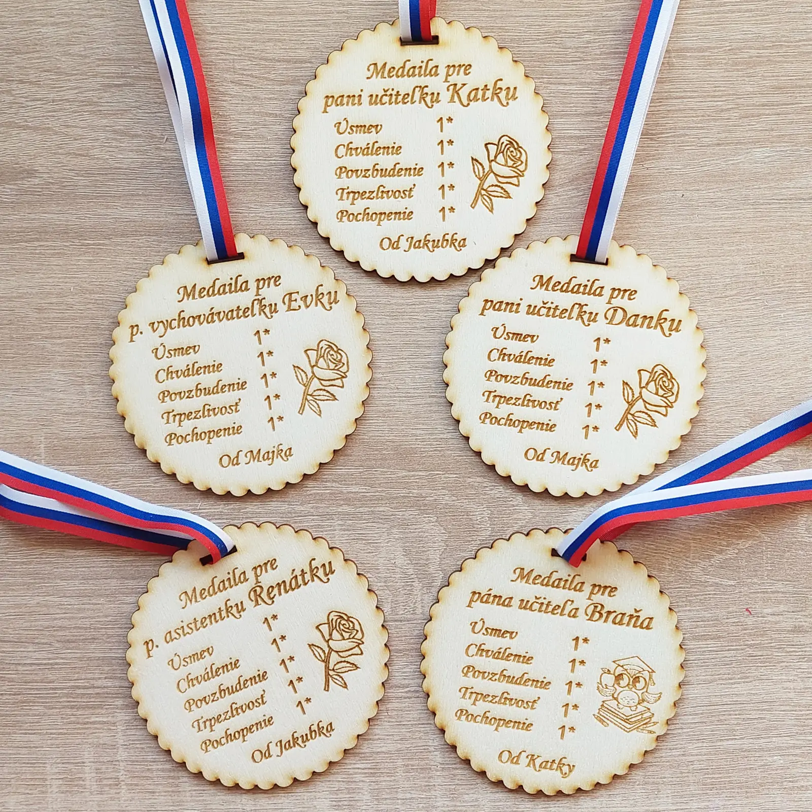 - Holzmedaille mit einem Durchmesser von 9 cm mit der Aufschrift "Herr Lehrer" oder einer anderen Widmung nach Wunsch.