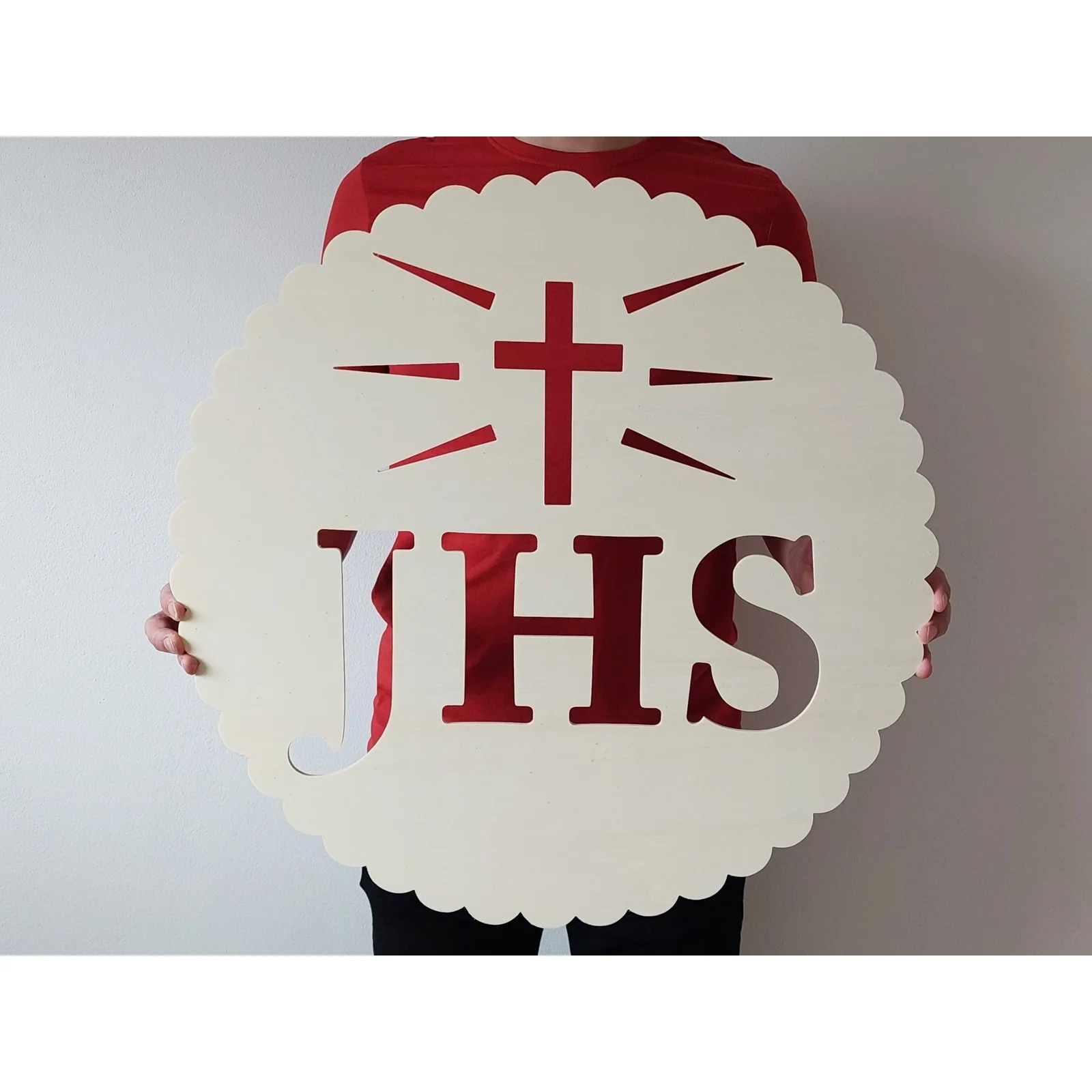 Holzschild mit dem christlichen Aufdruck - JHS und Kreuz, Breite 42 cm