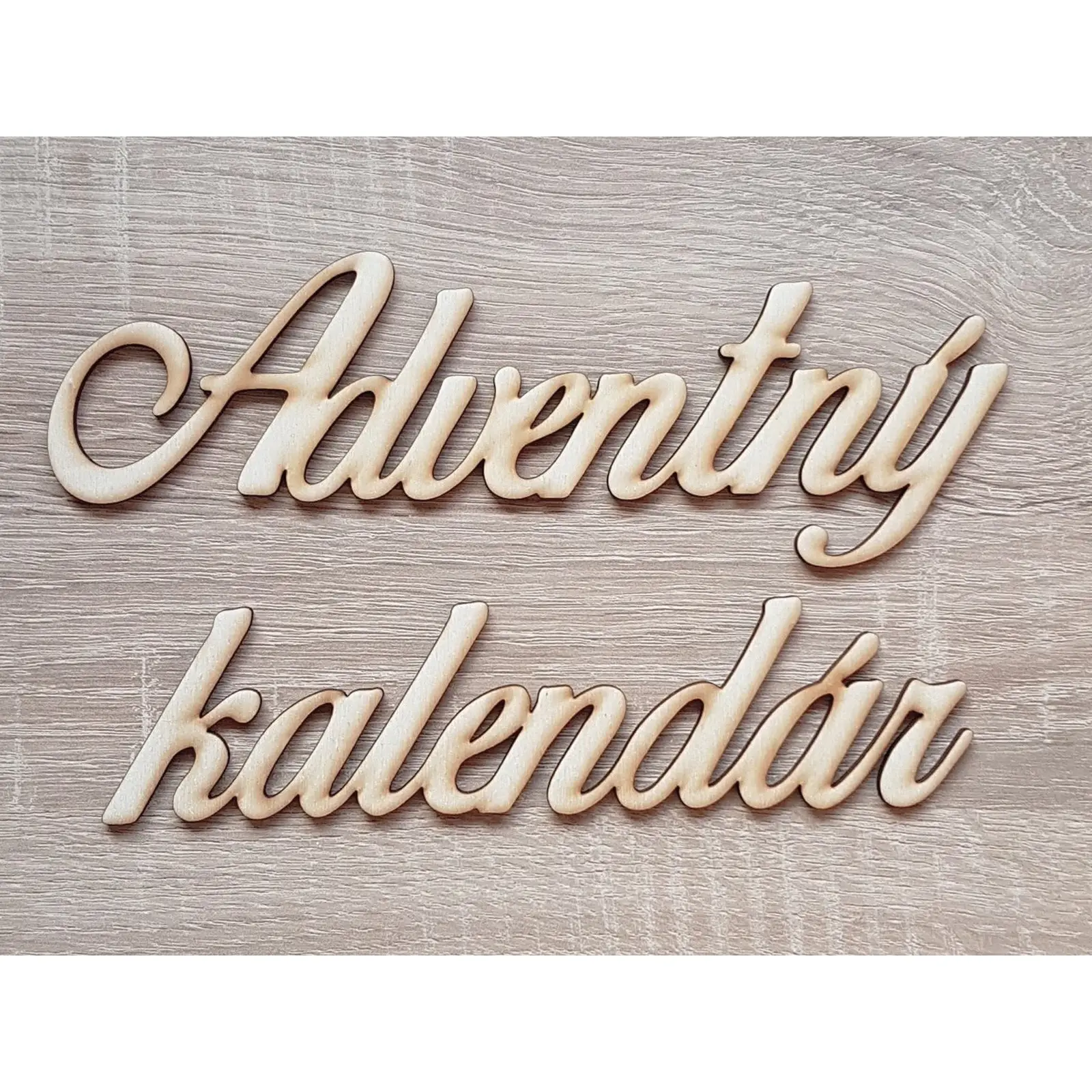 Die Aufschrift Adventskalender, Dicke 3 mm, Material Pappelholz-Plywood. Die Abmessungen passen auch auf die Kalendertafeln A, B, C und D.