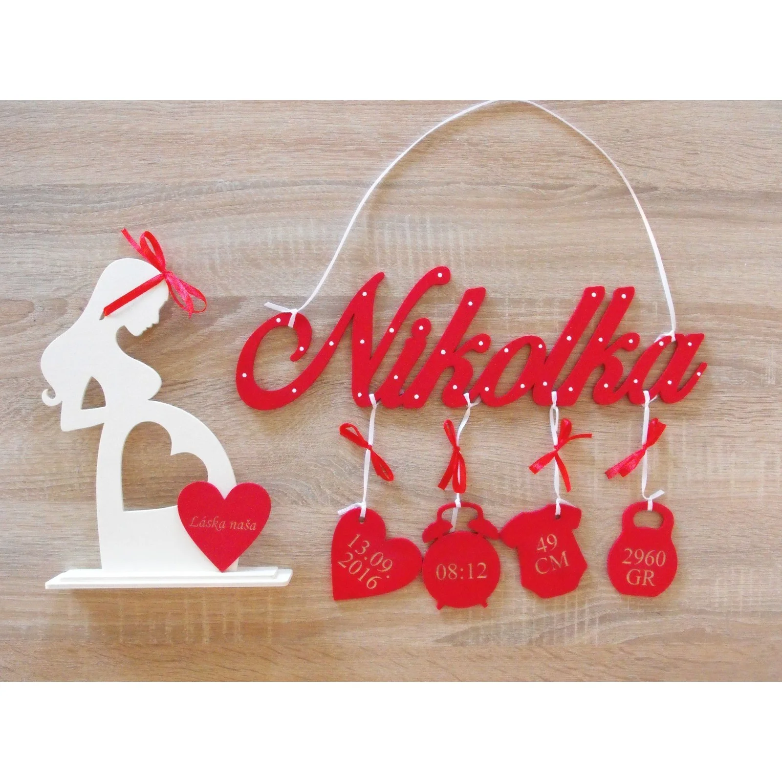 Na mieru urobené meno dieťatka so zavesenými údajmi o narodení: Dátum - Čas - Dĺžka - Váha.