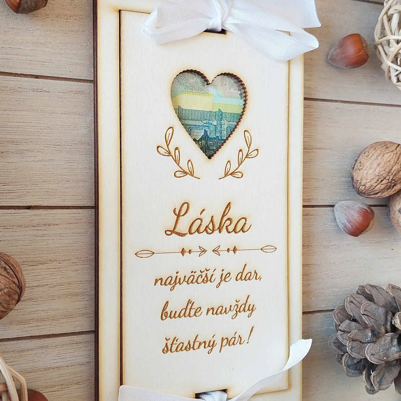 Hľadáte originálny a štýlový spôsob, ako darovať novomanželom peniaze? Táto drevená svadobná obálka je ideálnym riešením! Je vyrobená z kvalitného dreva a má rozmer 20x10cm, čo je ideálne pre vloženie bankoviek.