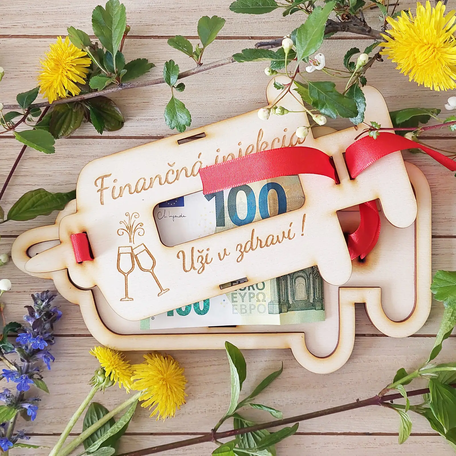 Drevená obálka na peniaze Finančná injekcia 22cm