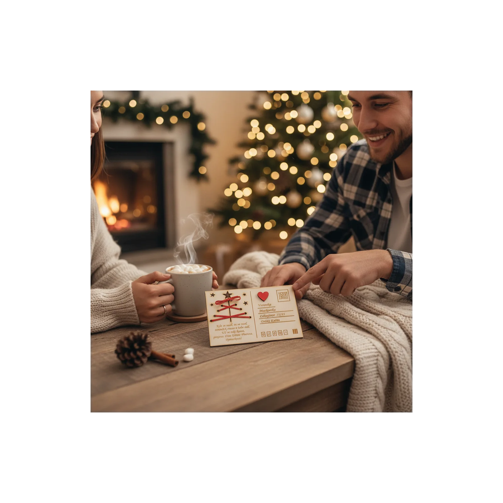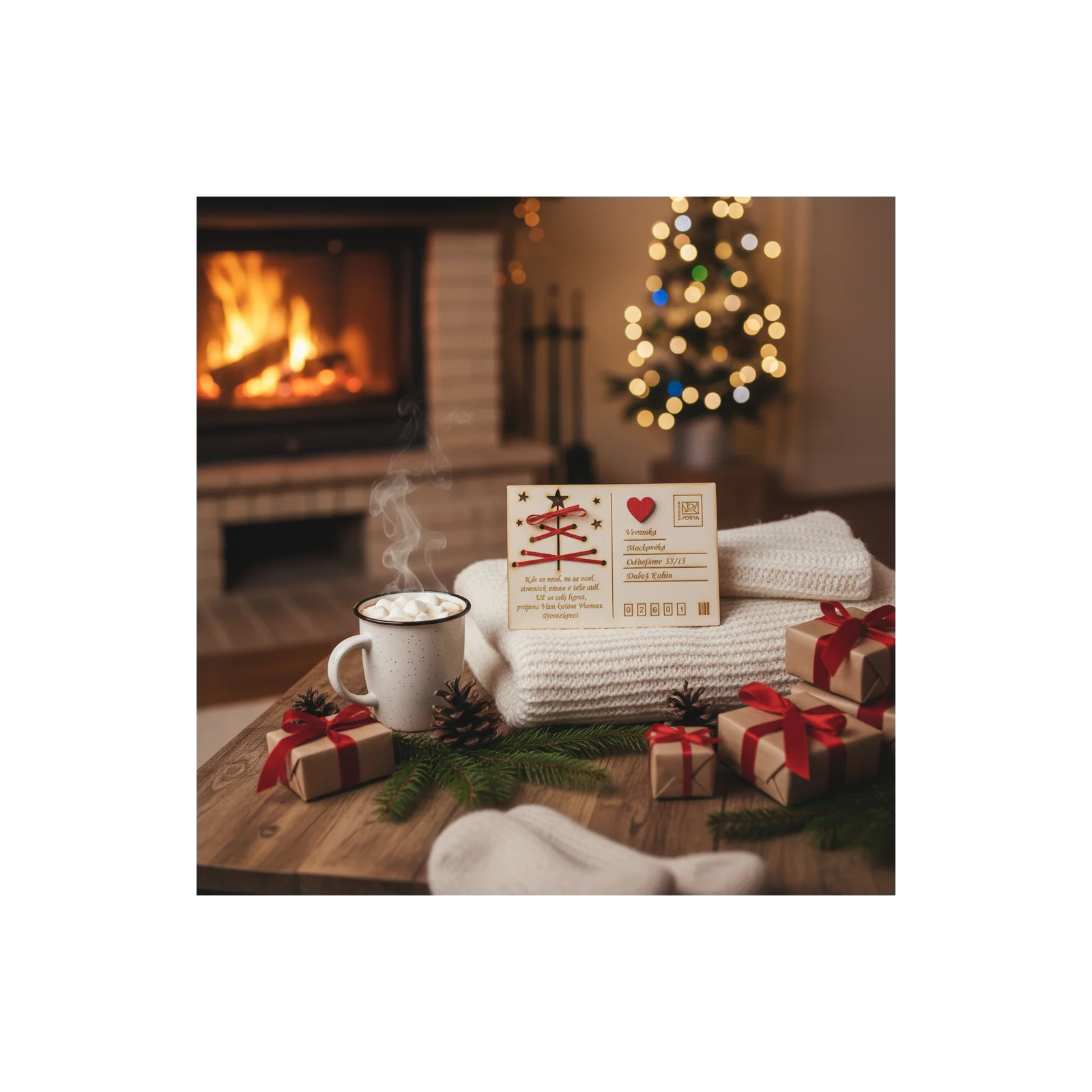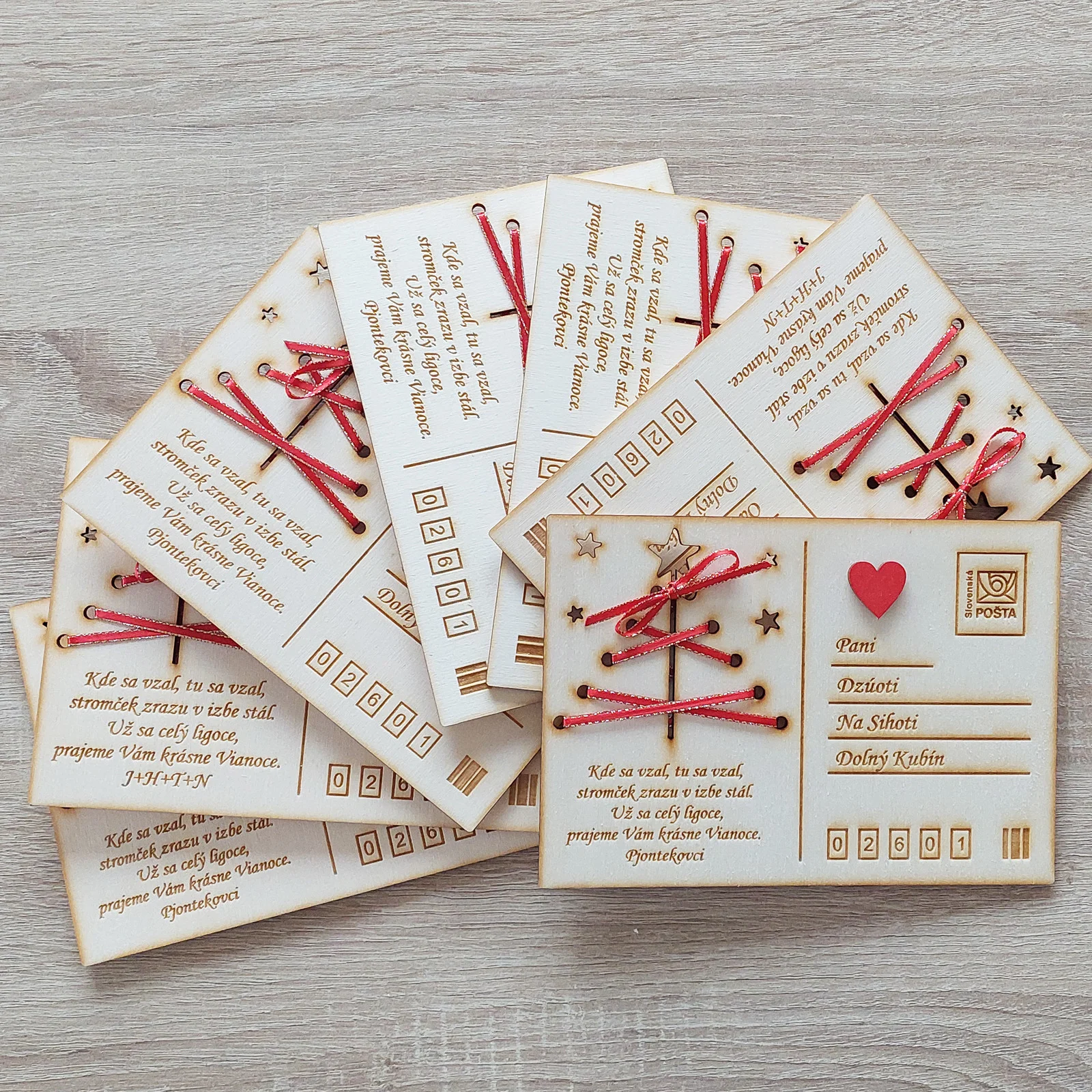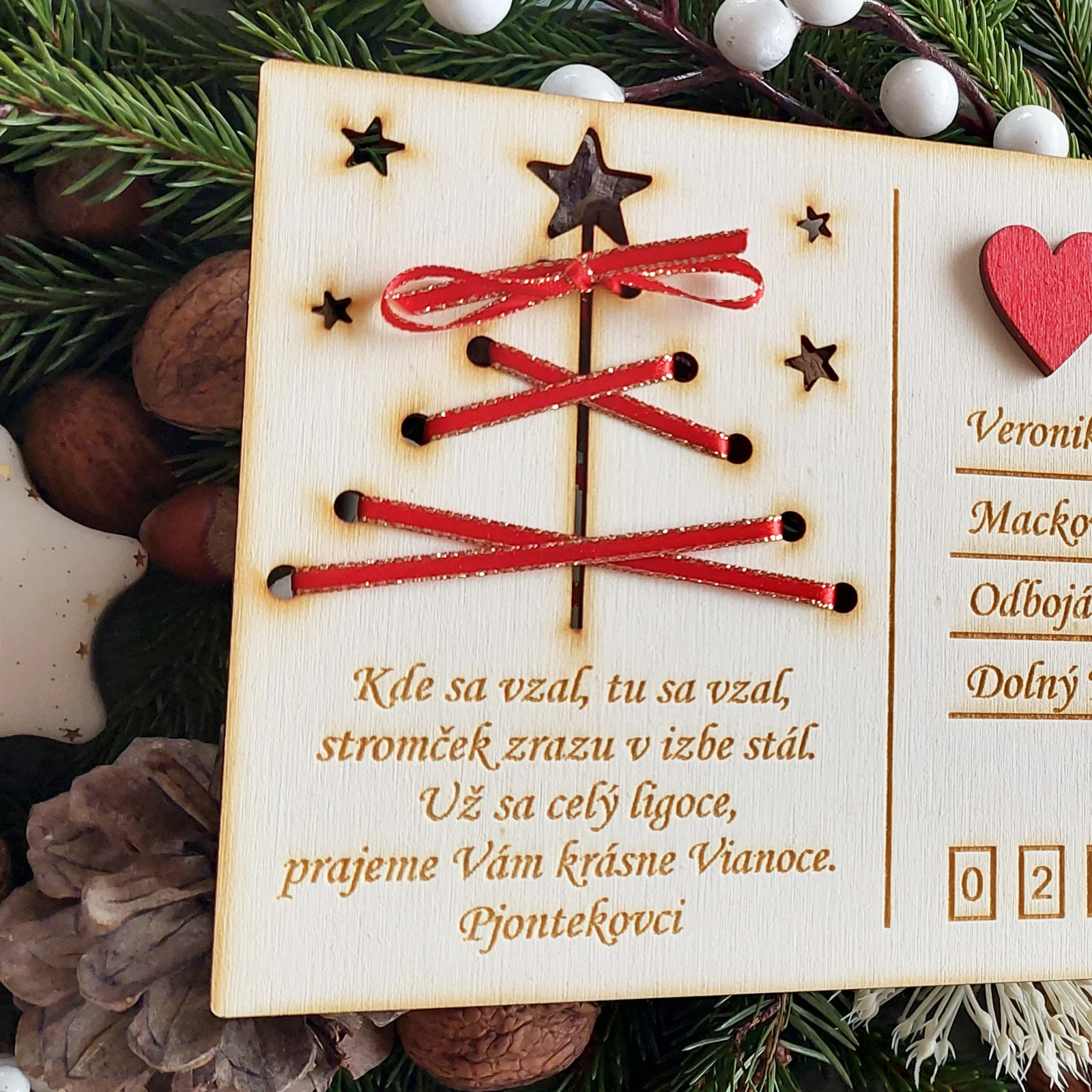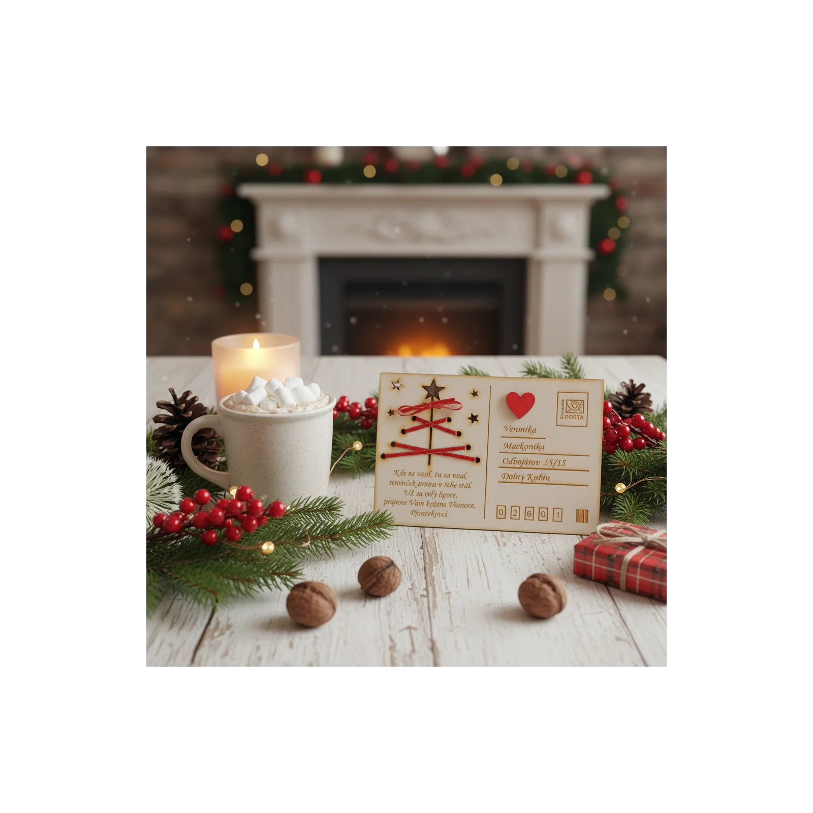 Predstavujeme vám drevenú vianočnú pohľadnicu – unikátne spojenie tradície, prírodného materiálu a vášho osobného odkazu.