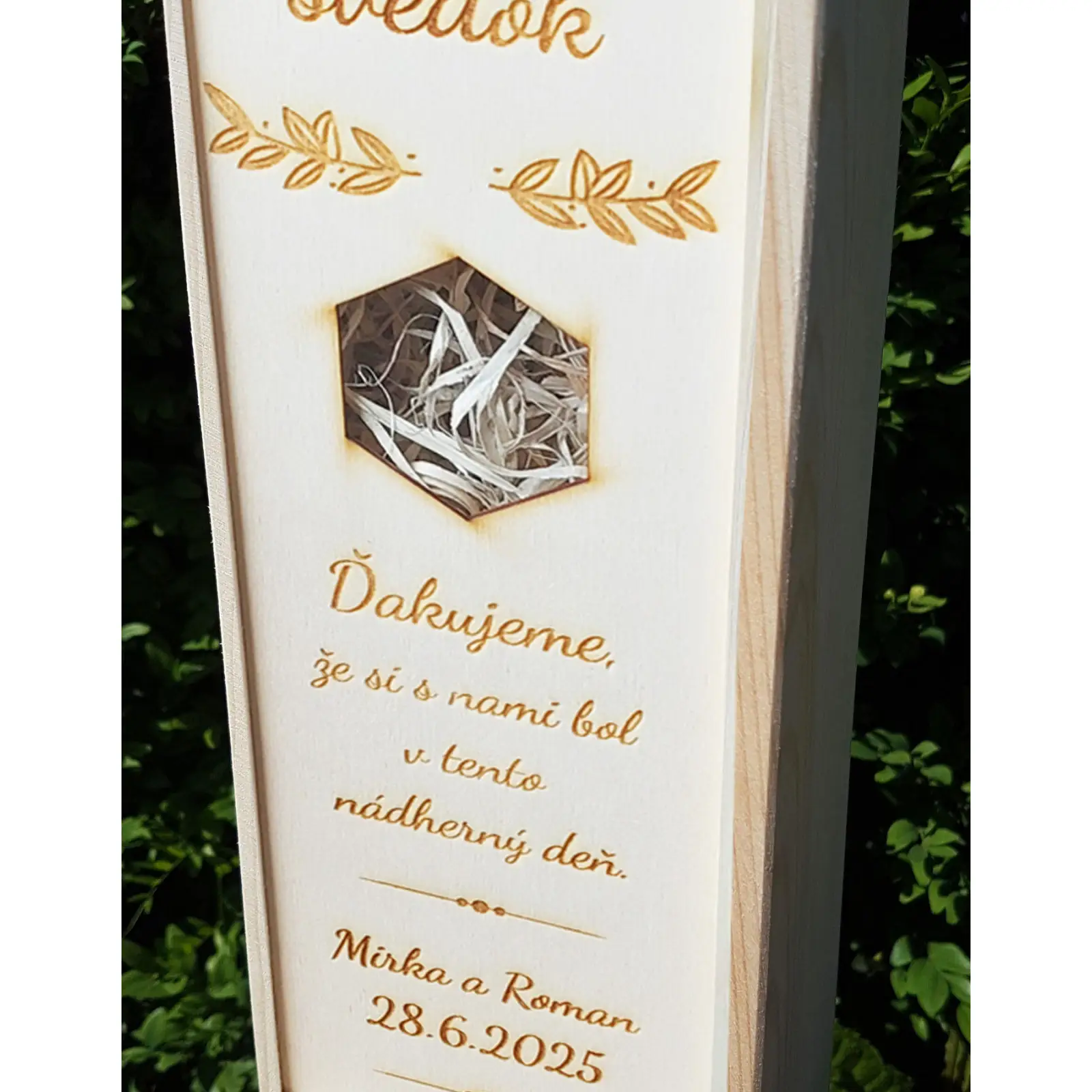 Drevený vínny obal "Najlepší svedok" je dokonalým spôsobom, ako poďakovať vašim svedkom za to, že s vami zdieľali váš nezabudnuteľný deň. Tento obal je navrhnutý tak, aby objal fľašu ich obľúbeného vína (nie je súčasťou balenia) a premenil ju na osobný a trvalý suvenír. Je ideálny ako darček z vďaky pre svedkov po svadbe, alebo ako štýlový doplnok k fľaši vína, ktorú im venujete.