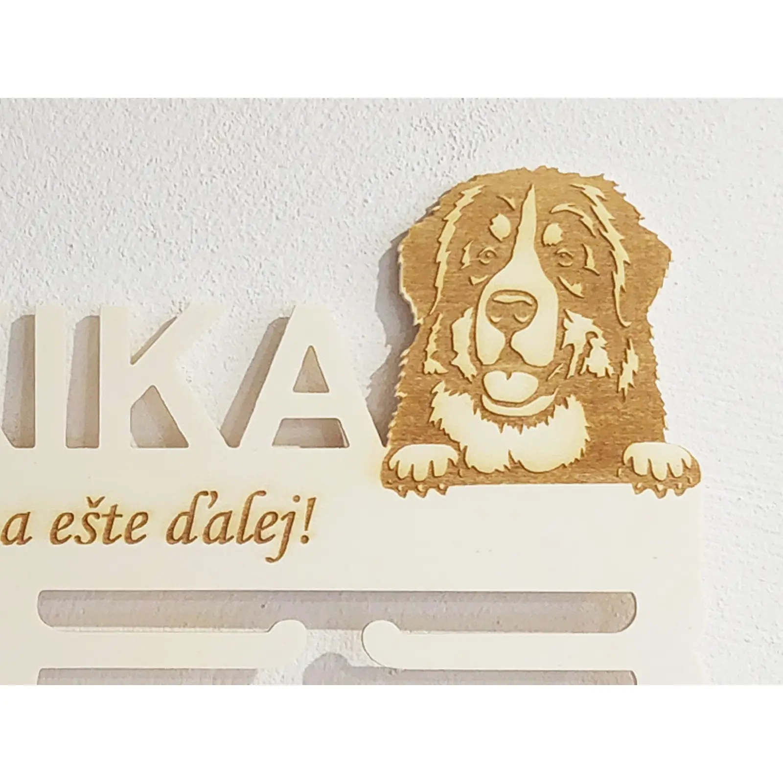 Never let your precious medals lie disorganized in a drawer or hide in a closet again. We present to you an exclusive wooden medal holder with laser engraving, which is not only practical but also an aesthetically pleasing addition to any home. This 45cm wide holder is beautifully adorned with the motif of a Bernese Mountain Dog, adding a unique charm and elegance to the entire product.