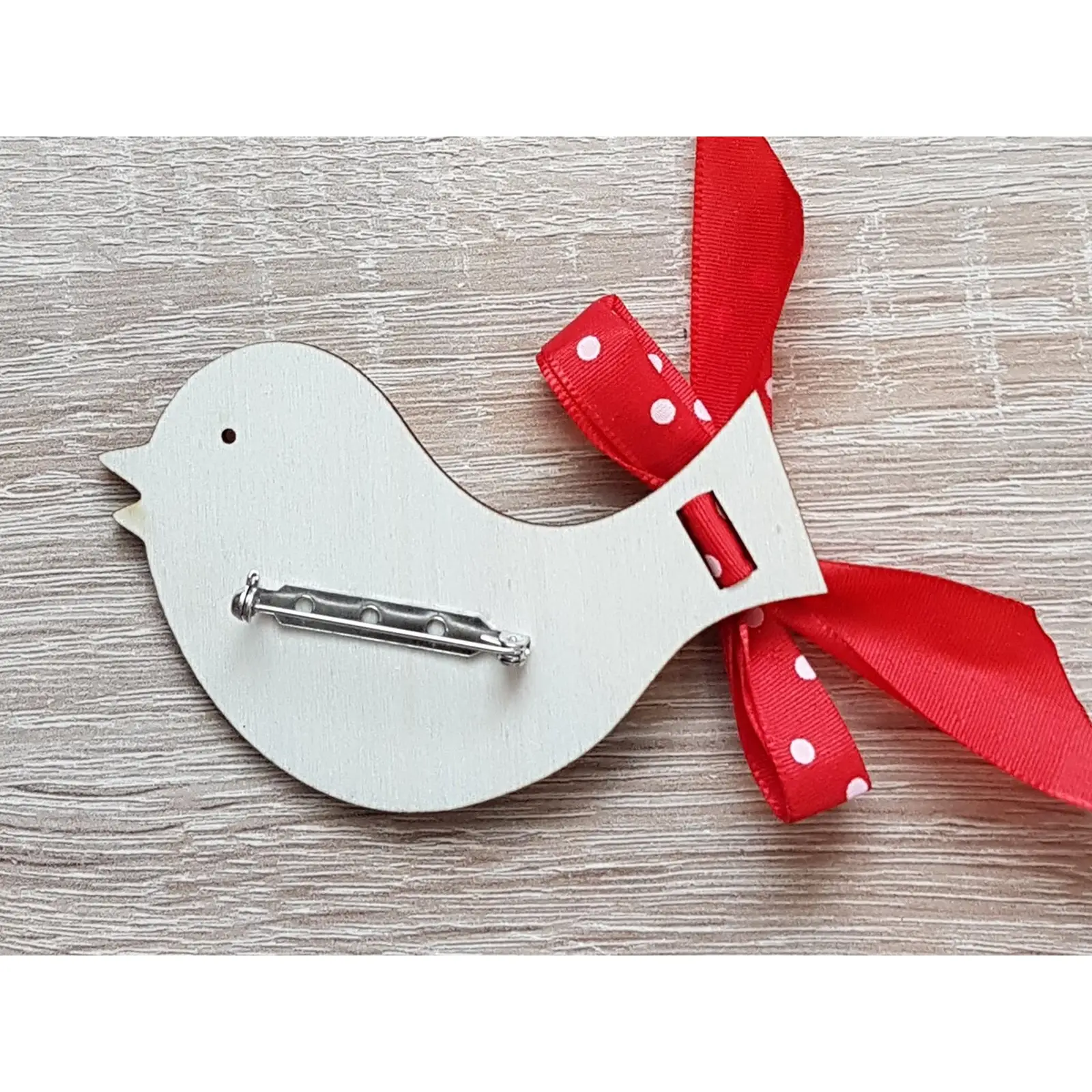 Made of 3mm thick poplar plywood decorated with a red ribbon and a pin.