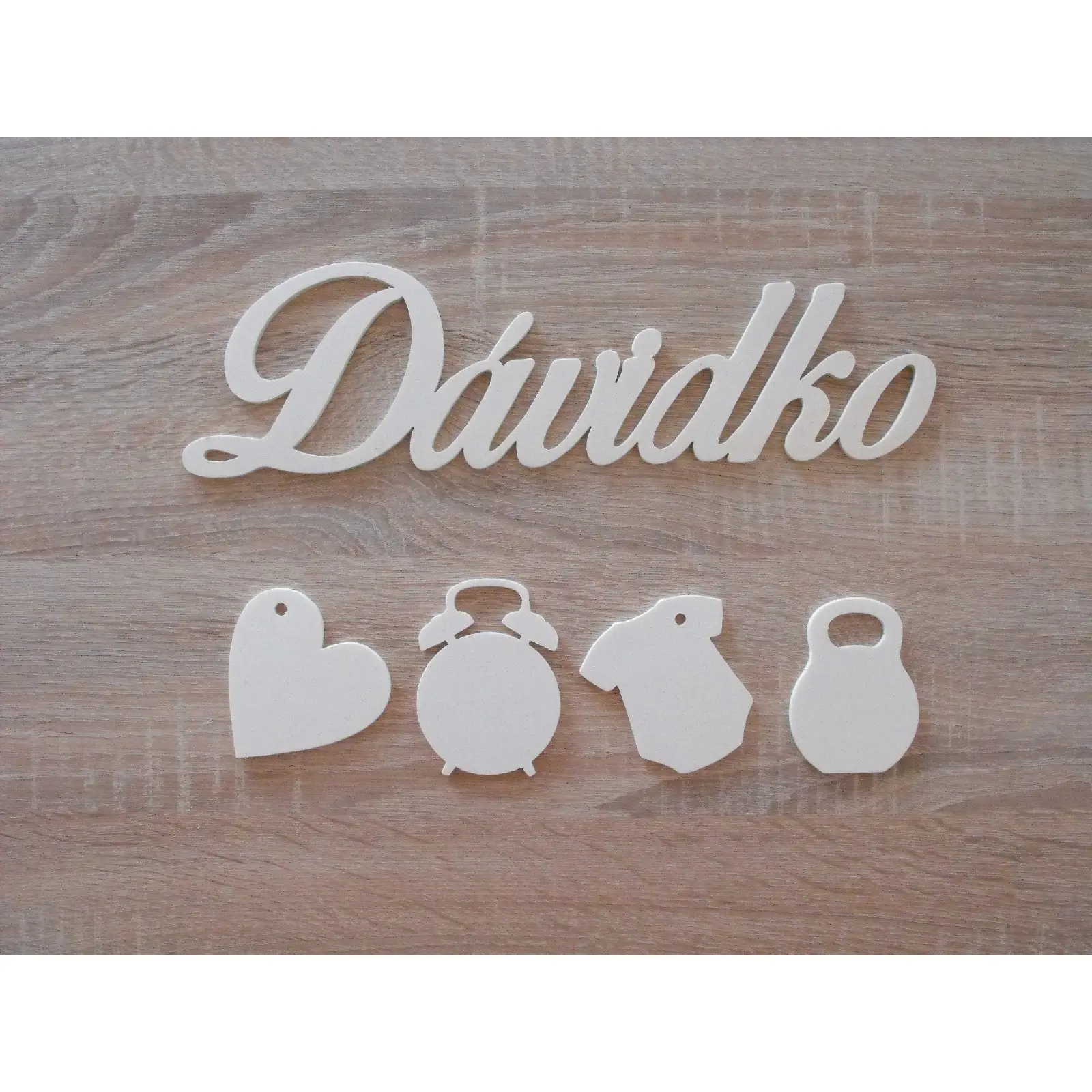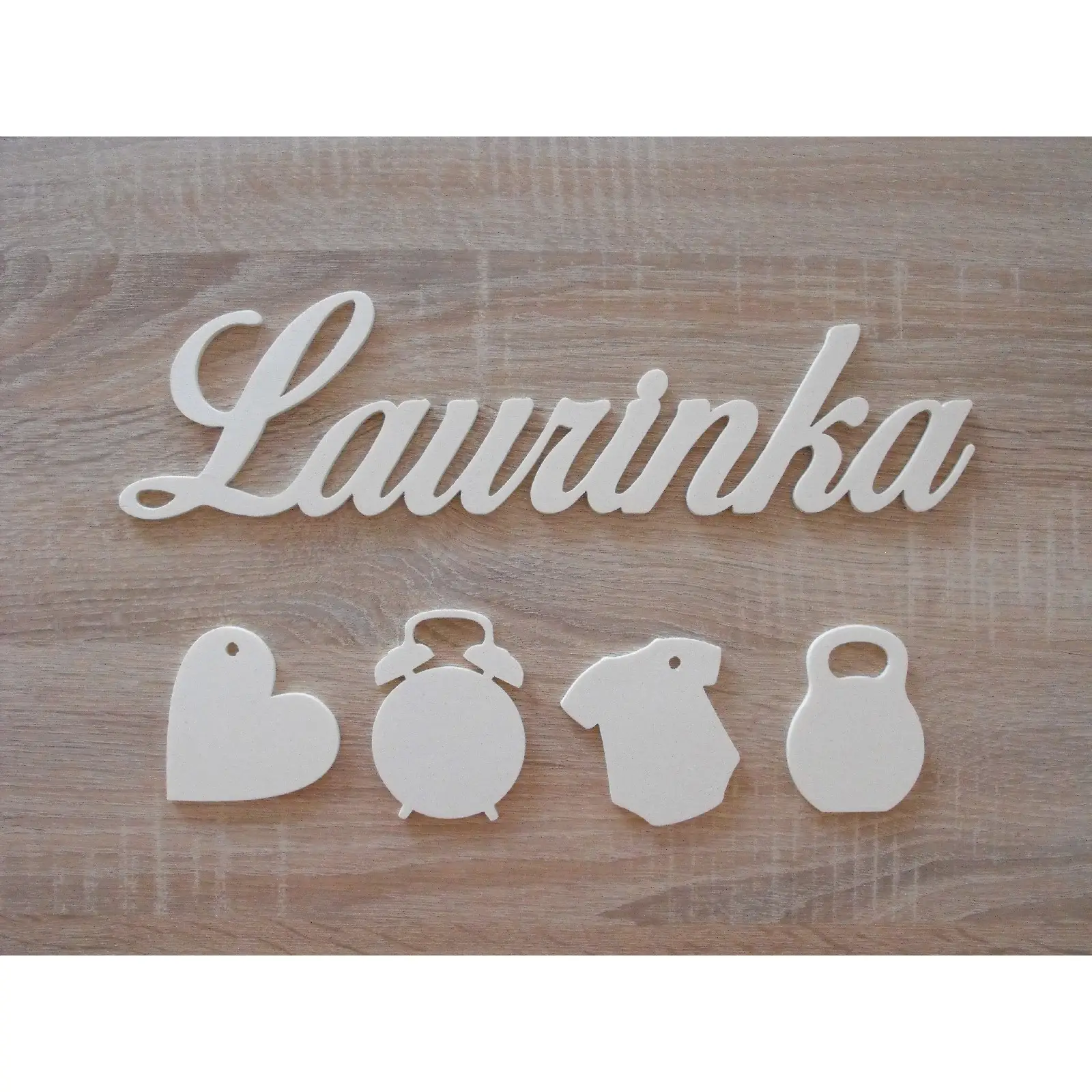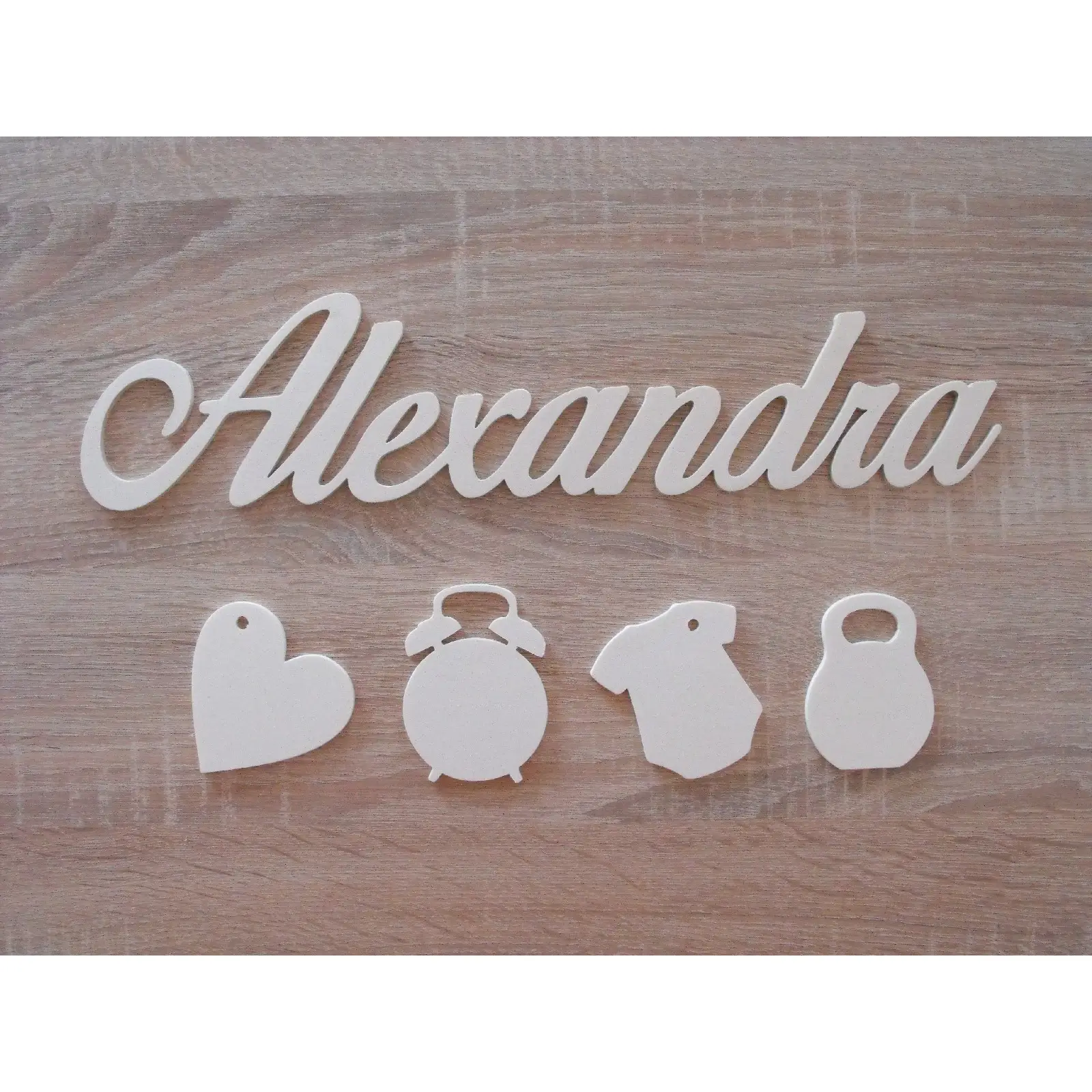 Custom made in a raw state, a child's name with hanging accessories such as a heart, alarm clock, t-shirt, and a weight on which you can write the Date - Time - Length - Weight of the baby.