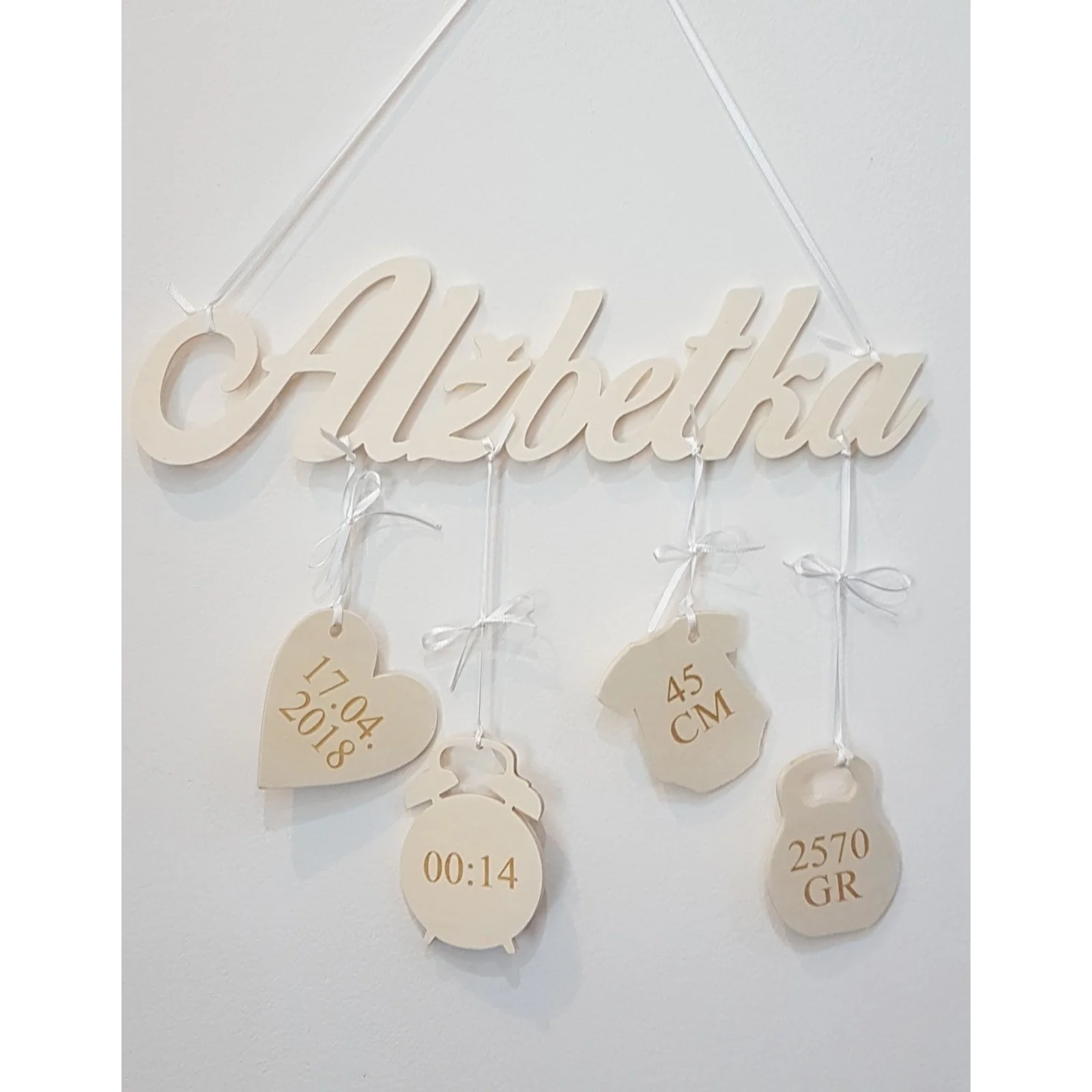 Required information: Name and birth details + ribbons will be white and please specify the color of the bows (please write the name with diacritics).