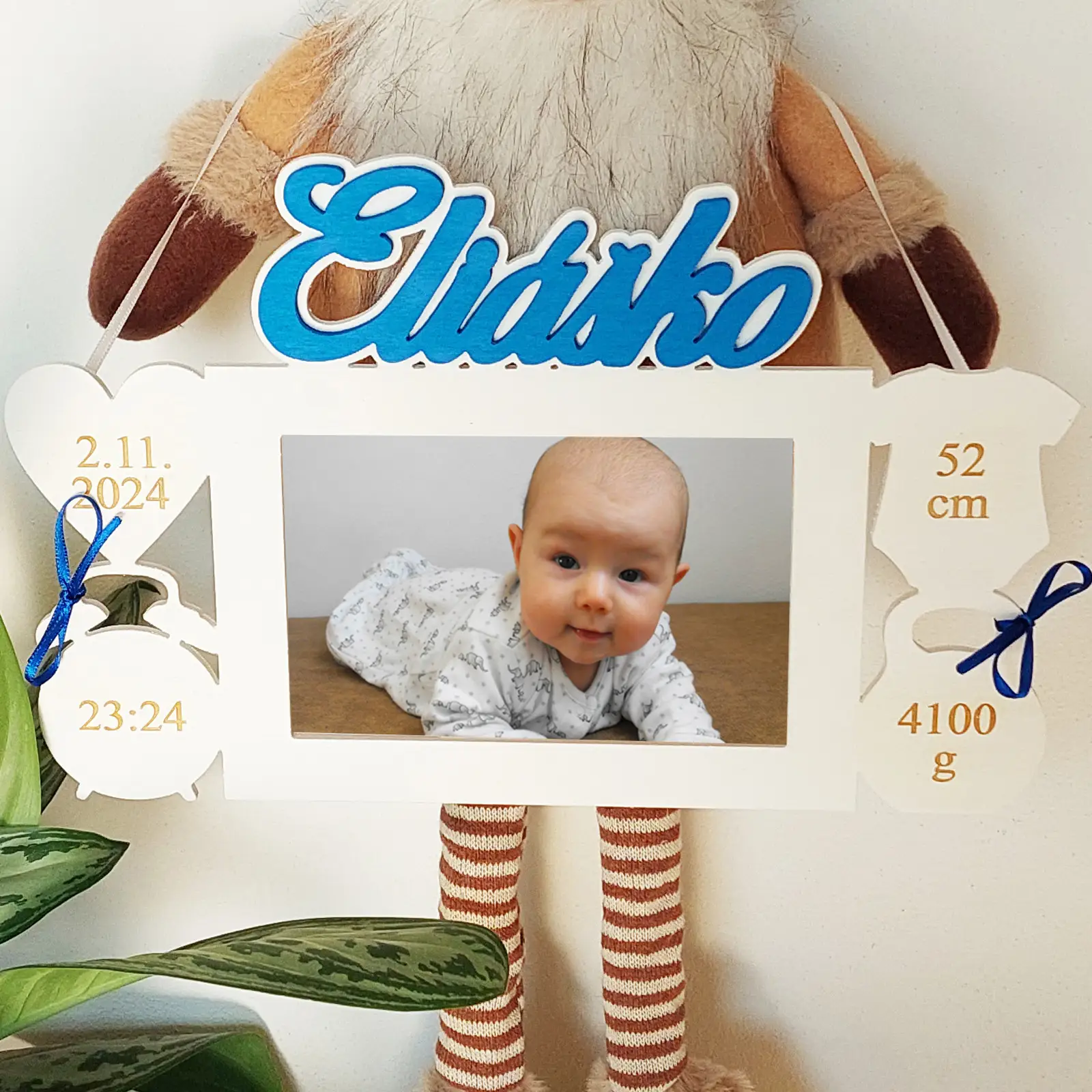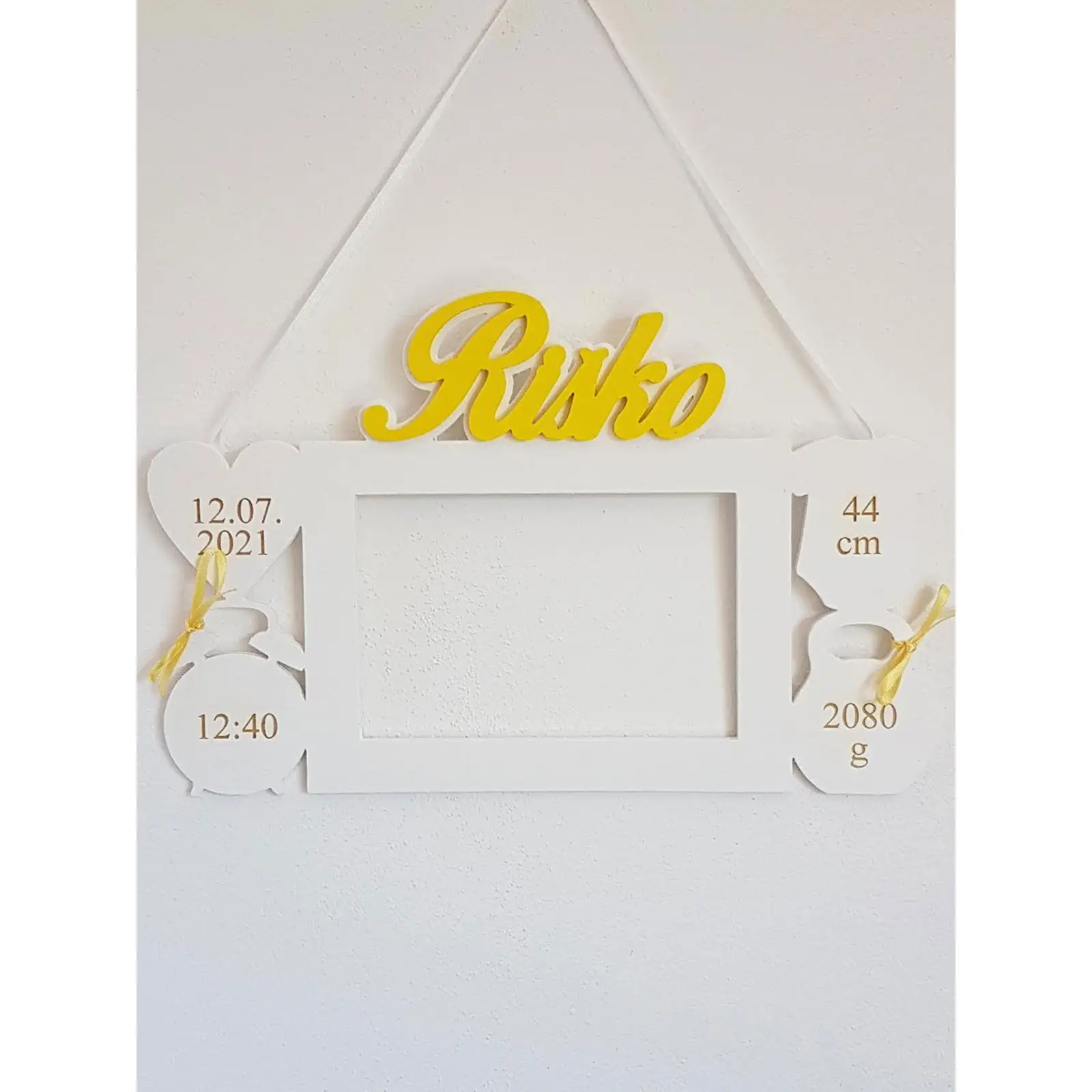 We have a great wall decoration for your little one's nursery. The two-tone photo frame with name and details is made of 4 mm thick plywood with 4 decorations on which the child's details are engraved.