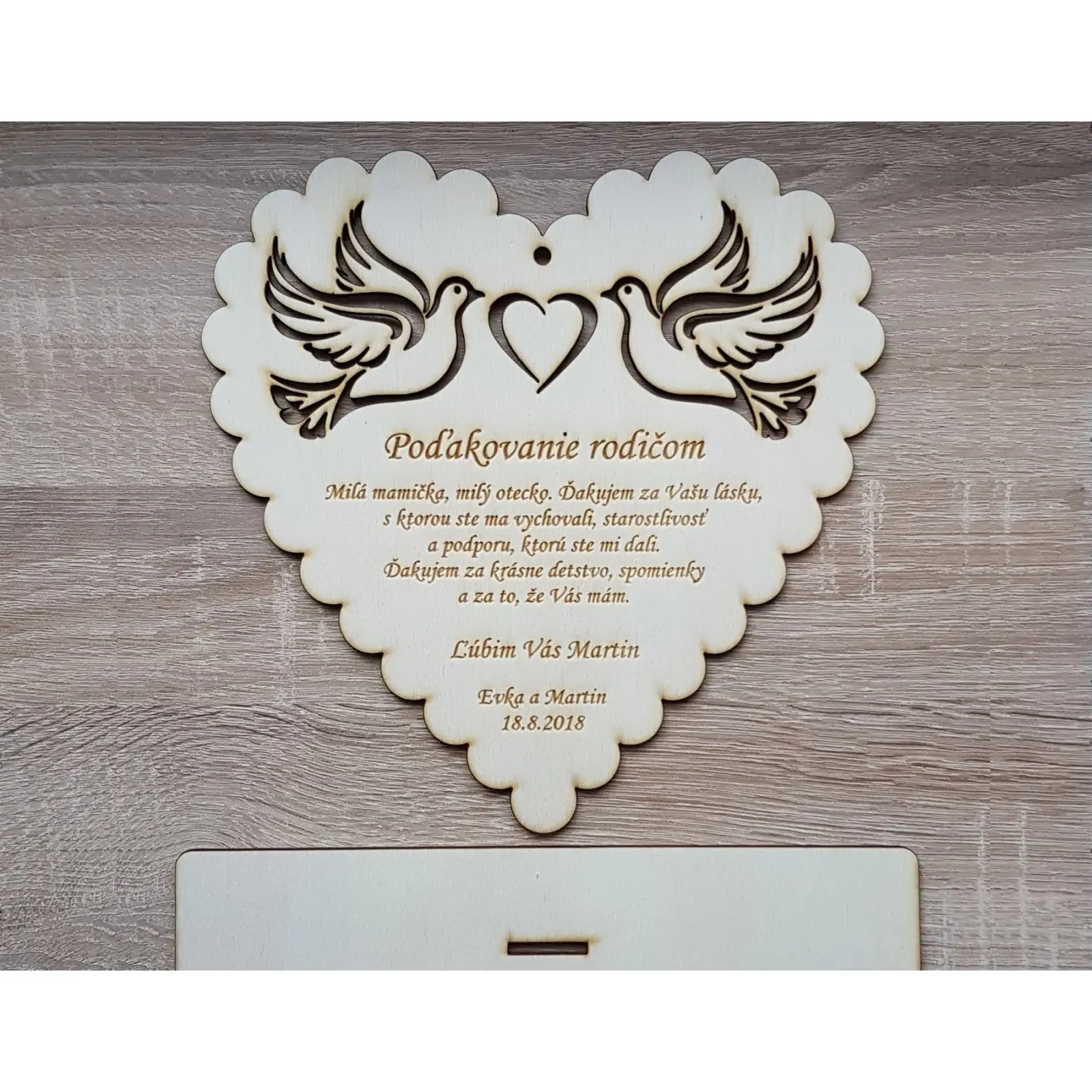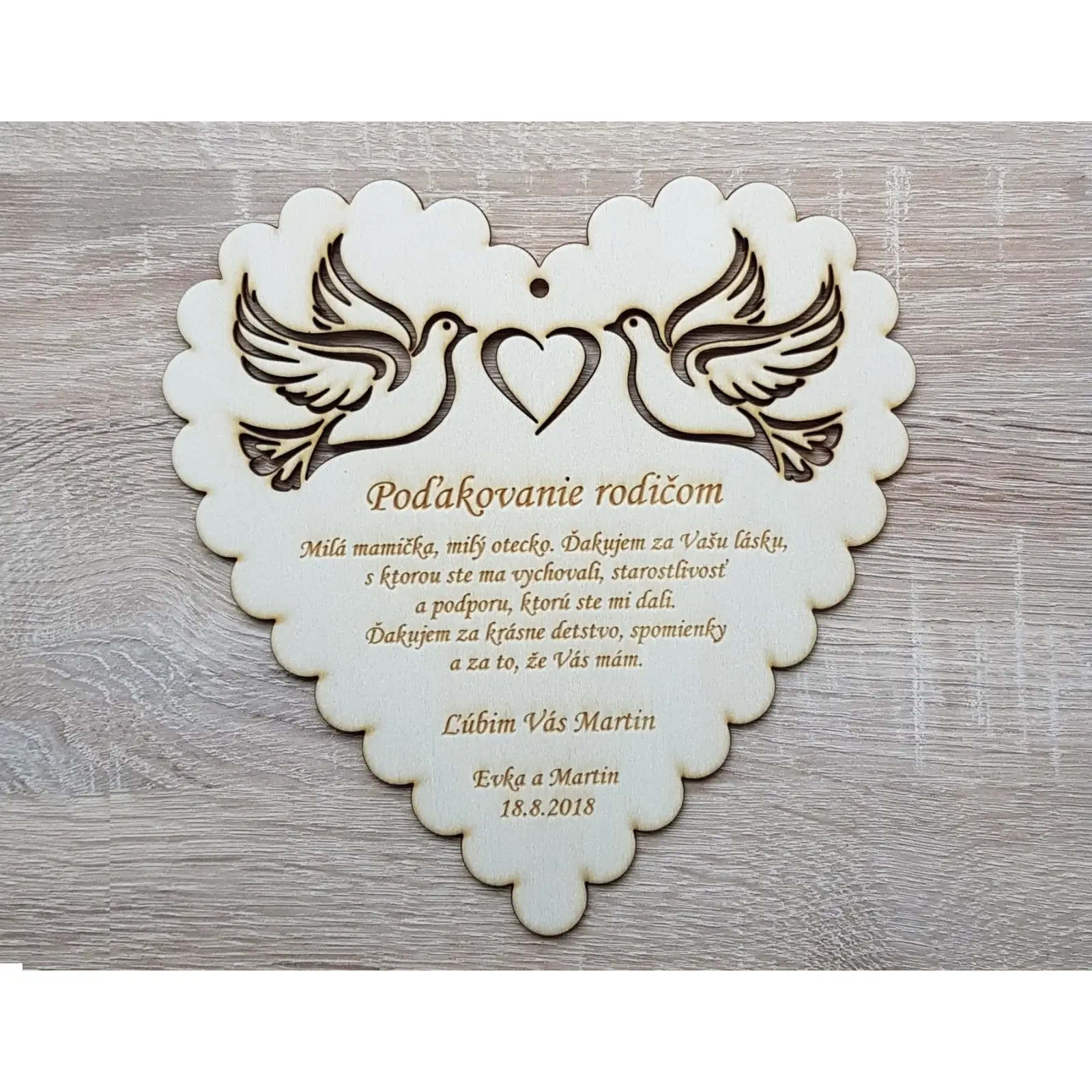 Wooden thank you to parents: Doves as a symbol of gratitude and love
