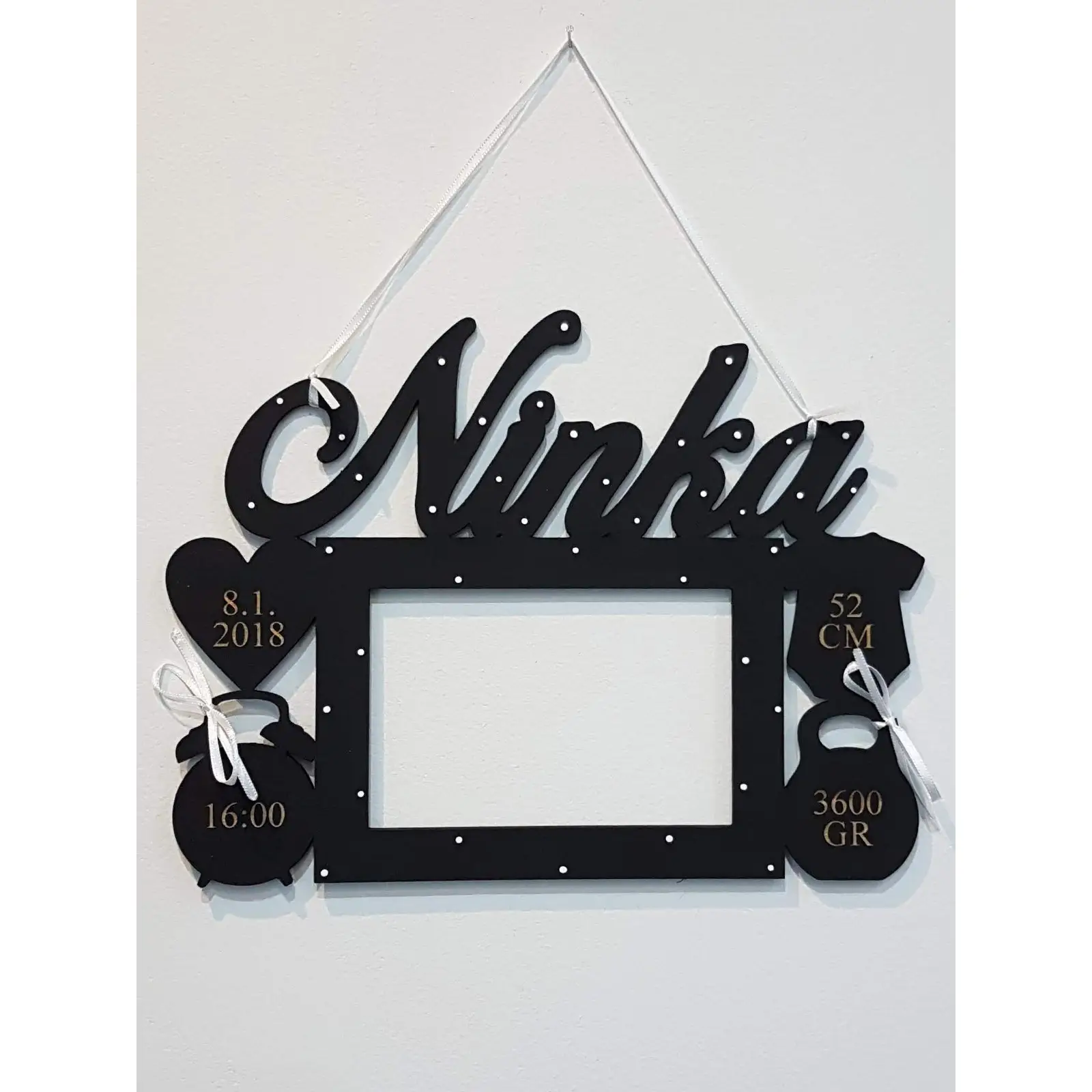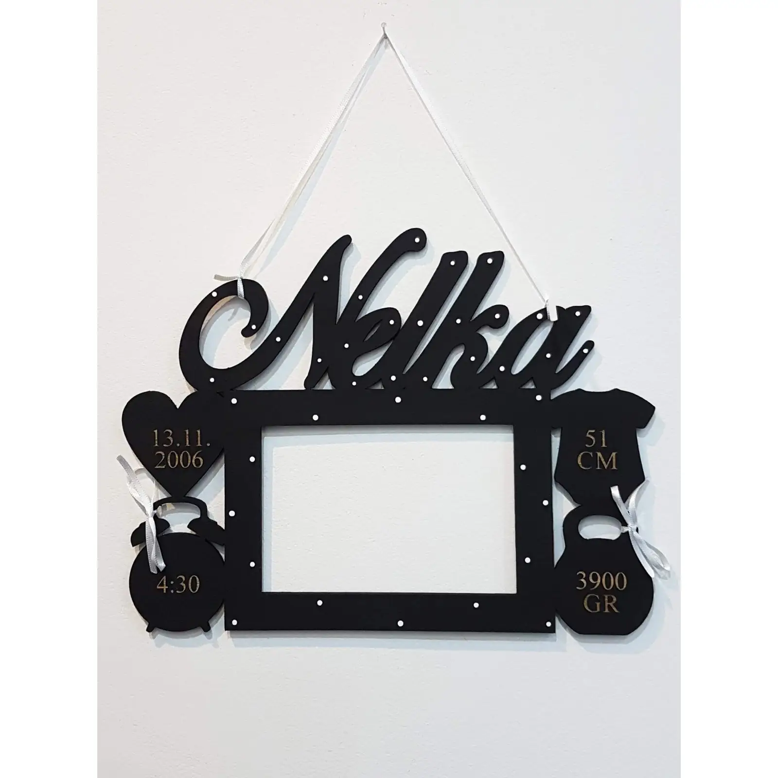 Máme pre Vás skvelú ozdobu na stenu do detskej izbičky Vášho drobčeka. Fotorámik s menom a údajmi je vyrábaný z preglejky hrúbky 4 mm so 4 dekoráciami na ktorých sú vygravírované údaje o dieťatku: čas, dĺžka, váha a deň narodenia.