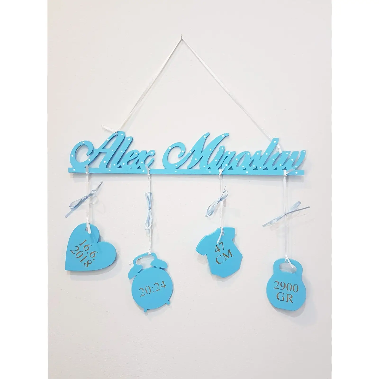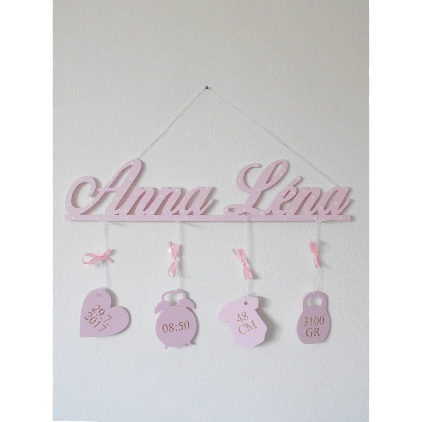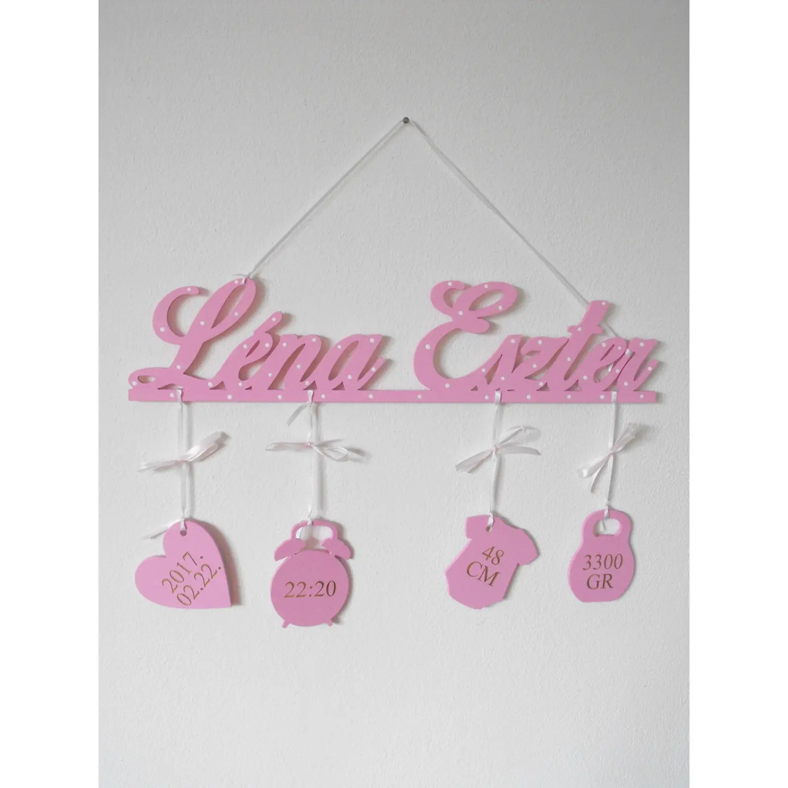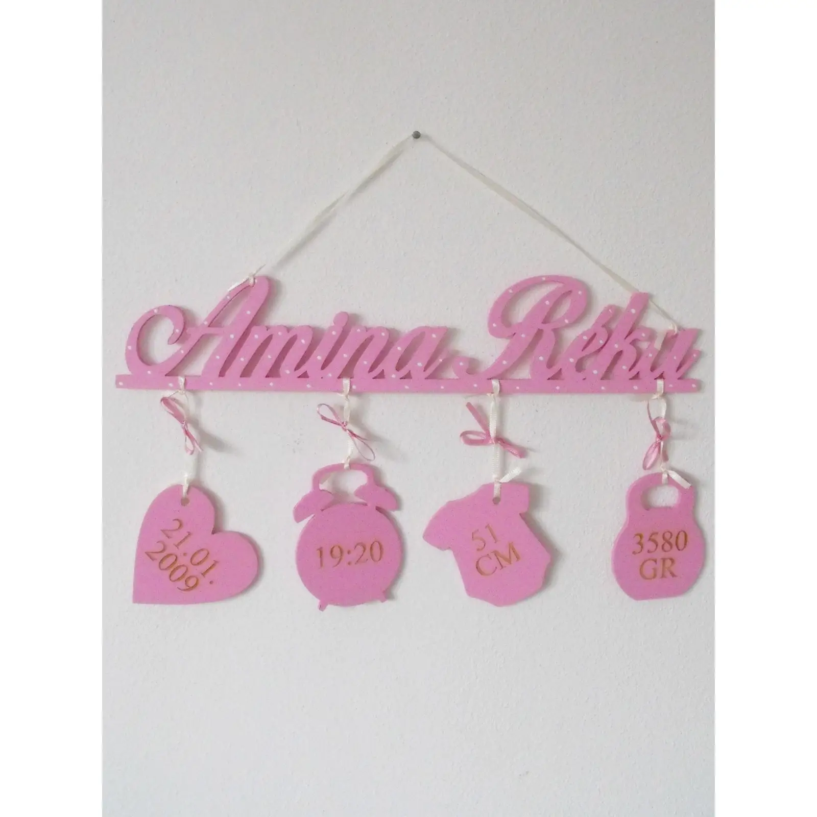 Na mieru urobené meno dieťatka so zavesenými údajmi o narodení: Dátum - Čas - Dĺžka - Váha.