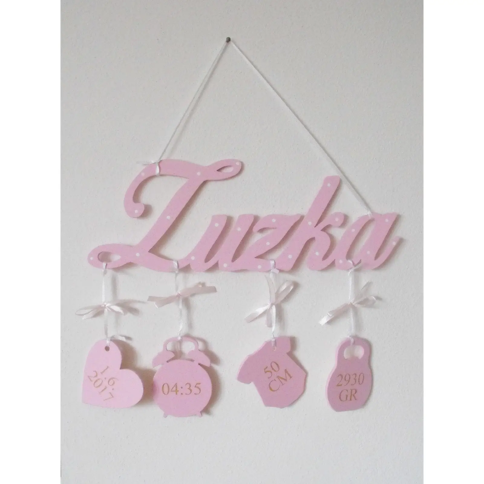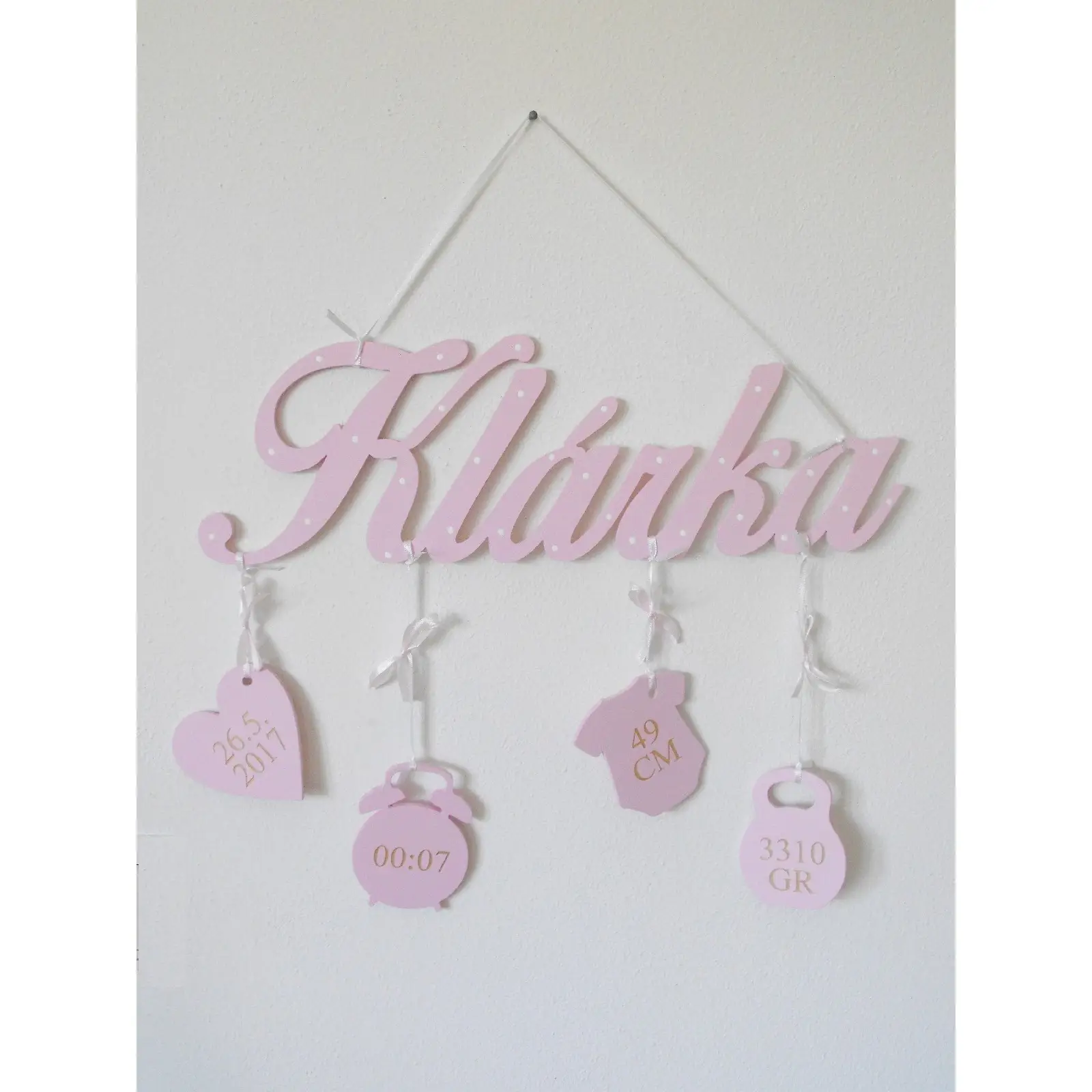 Na mieru urobené meno dieťatka so zavesenými údajmi o narodení: Dátum - Čas - Dĺžka - Váha.
