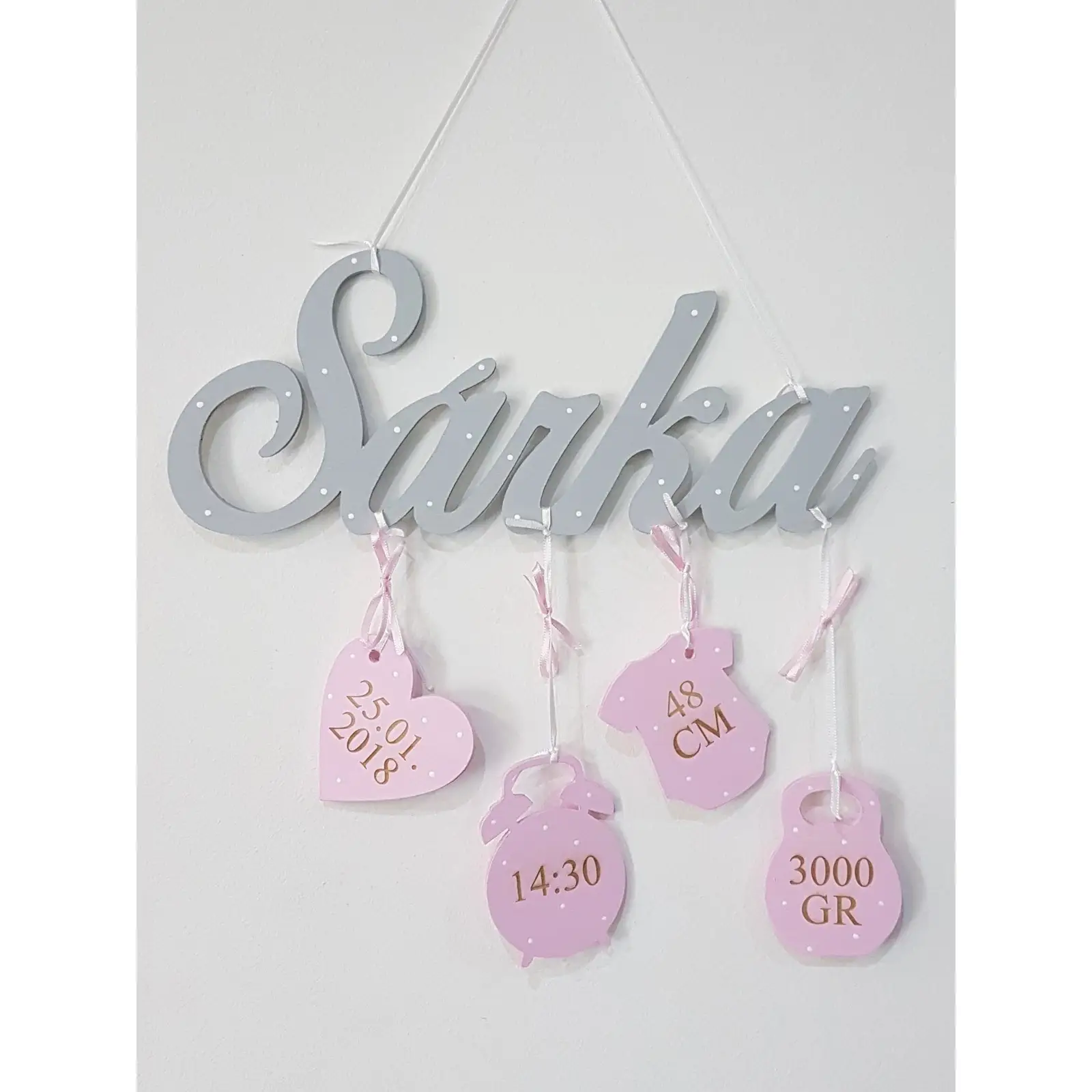 Na mieru urobené meno dieťatka so zavesenými údajmi o narodení: Dátum - Čas - Dĺžka - Váha.