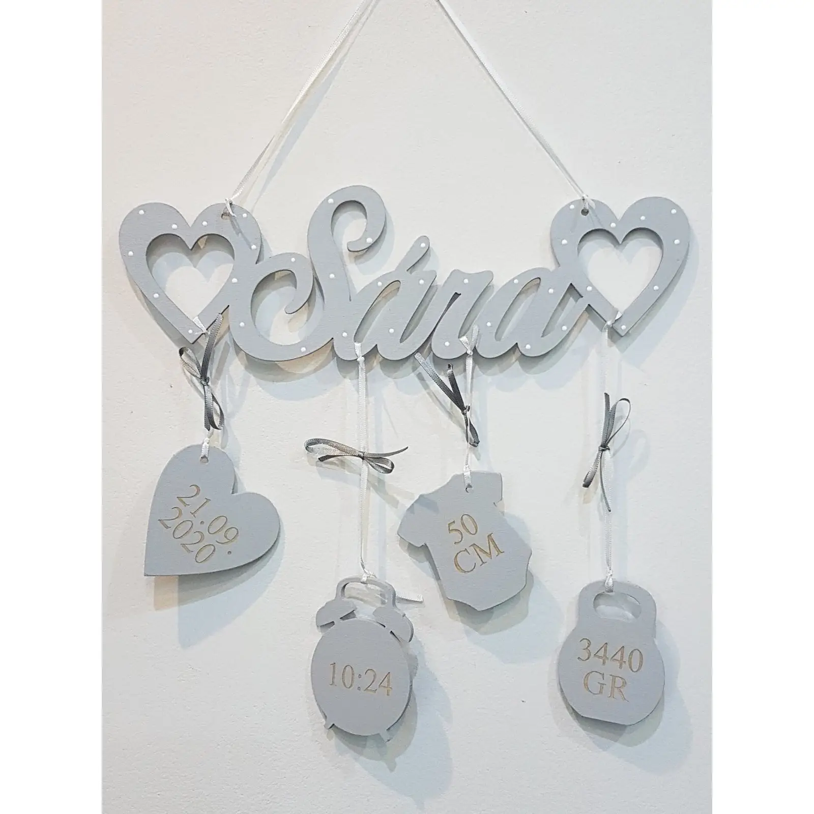 Srdcia fungujú ako elegantný rám, ktorý objíma meno a údaje bábätka. Celá dekorácia tak pôsobí harmonicky a vyvážene. Detské meno s údajmi na zavesenie.