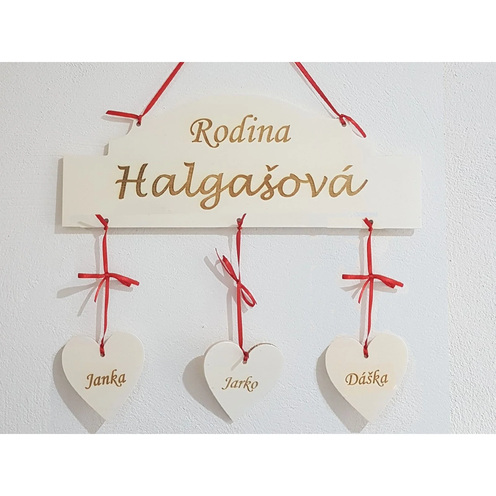 Táto personalizovaná drevená menovka s nápisom "RODINA" a tromi srdiečkami je krásnym a originálnym doplnkom, ktorý dodá vášmu domovu útulnosť a teplo.