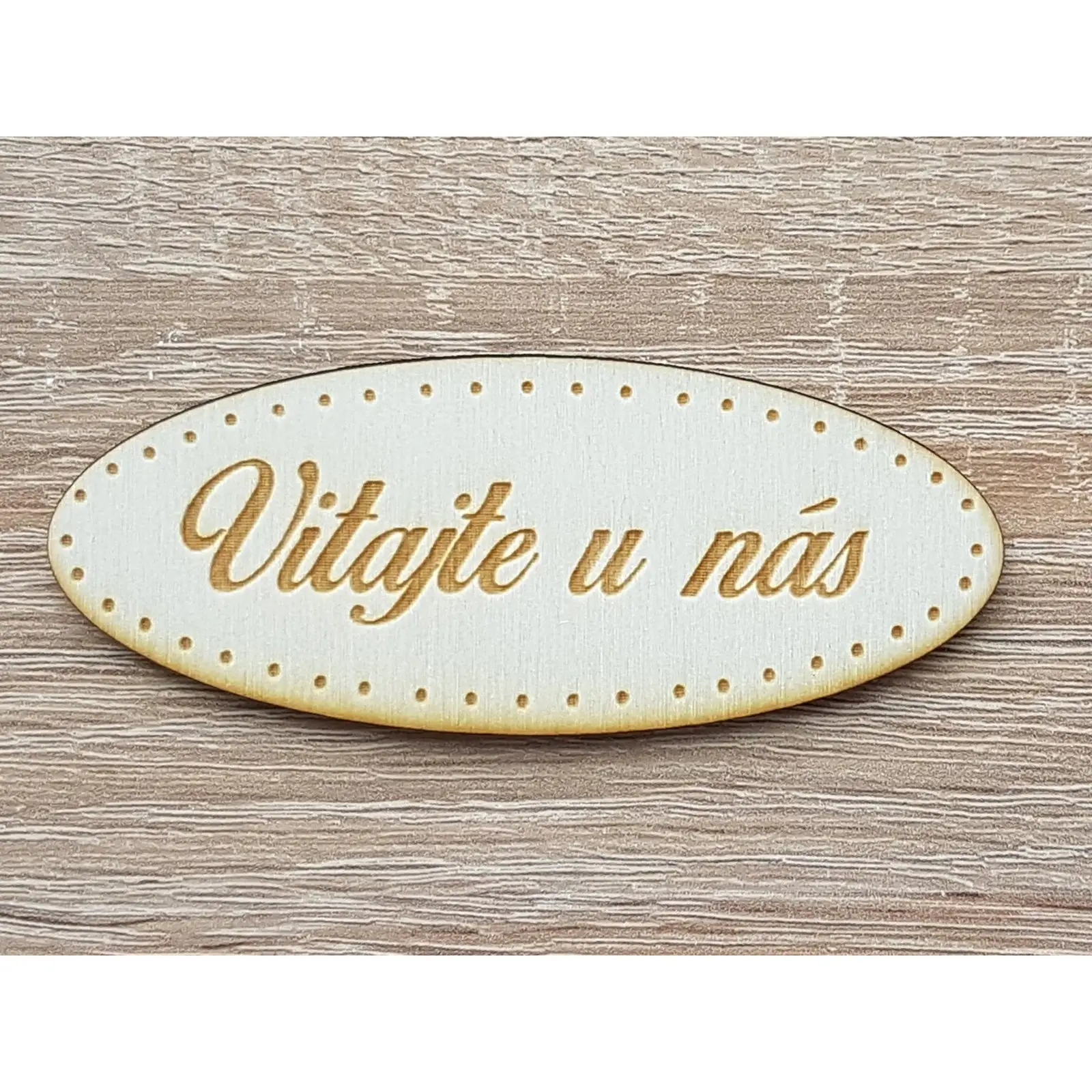 Nápis vitajte u nás na ceduľke rozmer 10x4cm hrúbka 3mm materiál topoľ.