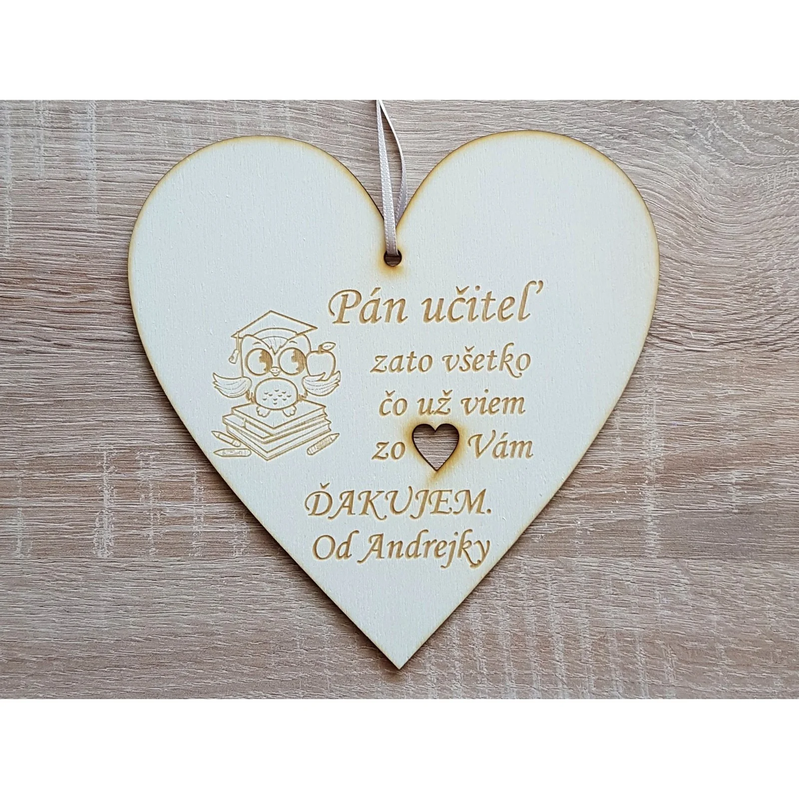 Drevená tabuľka srdiečko pre pána učiteľa ako poďakovanie za celý rok.