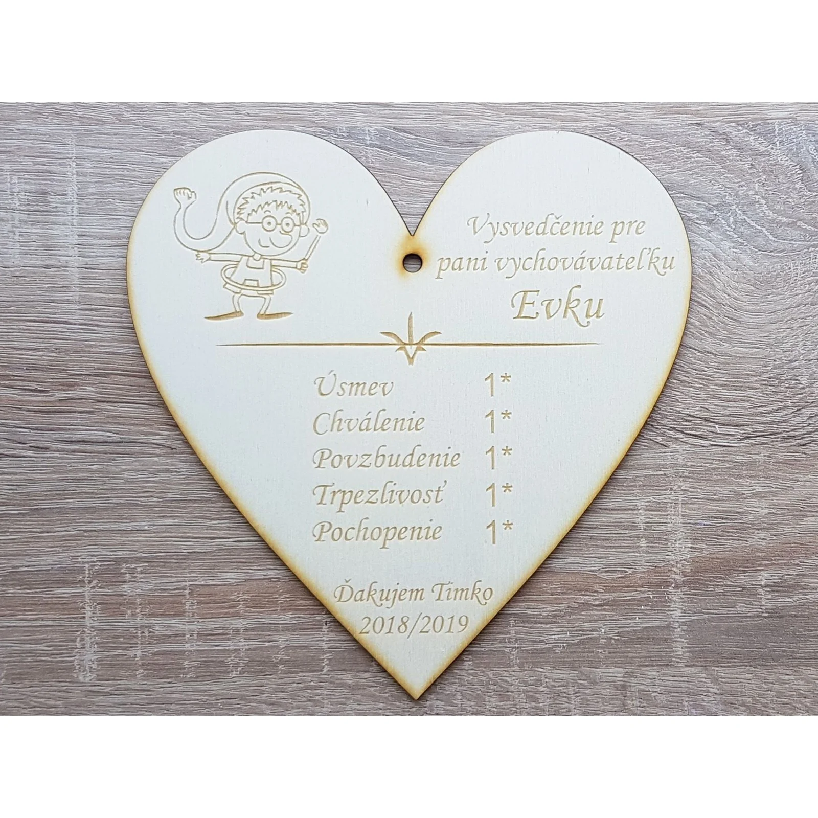 Vysvedčenie pre pani vychovávateľku laserované srdiečko veľkosť 17cm hrúbka 3mm materiál topoľ.