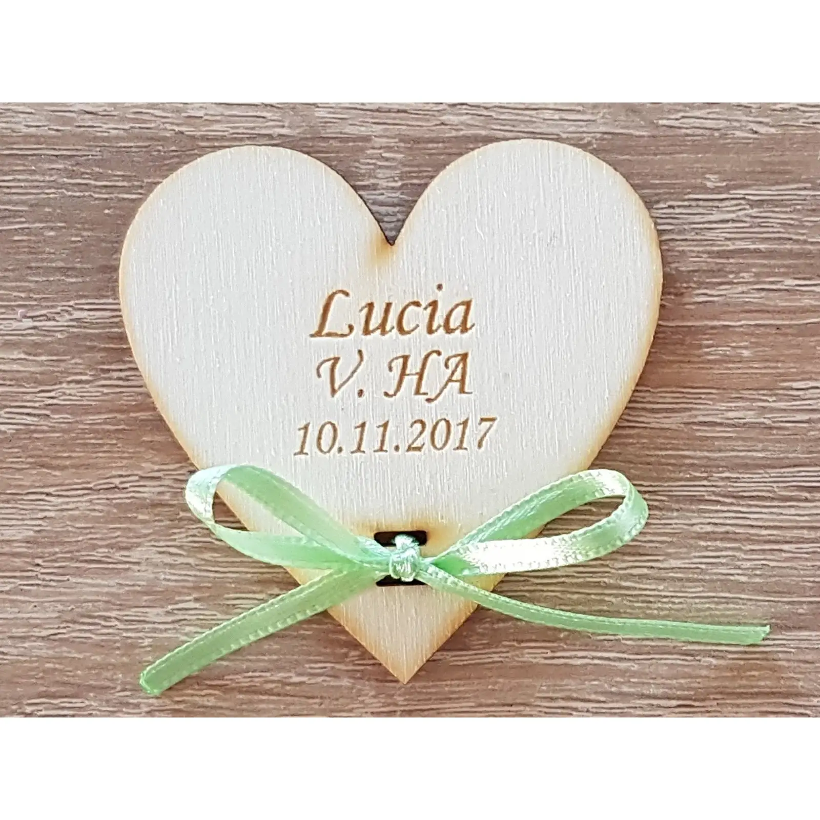 Výroba laserom a ozdobené zelenou stužkou.