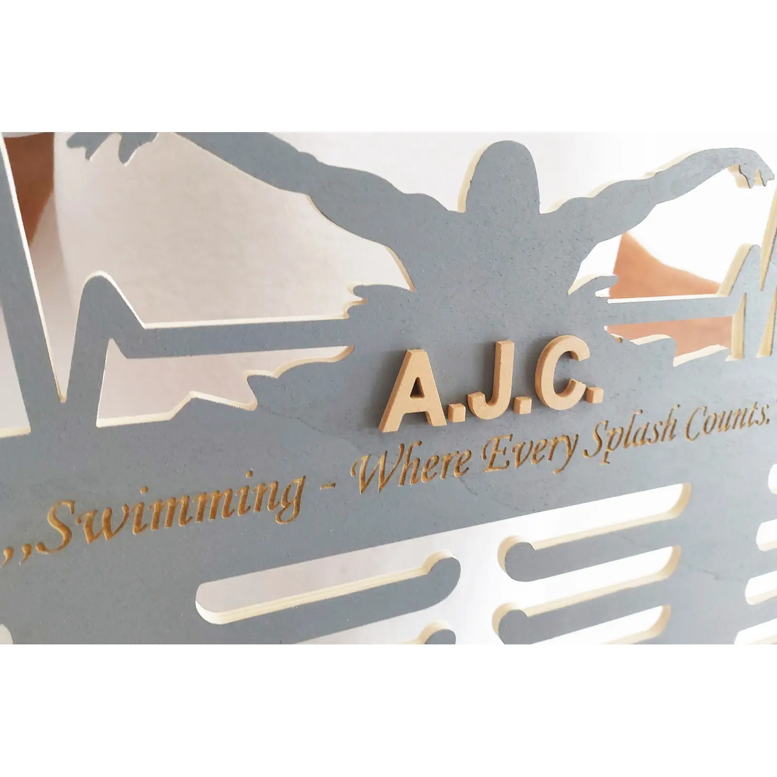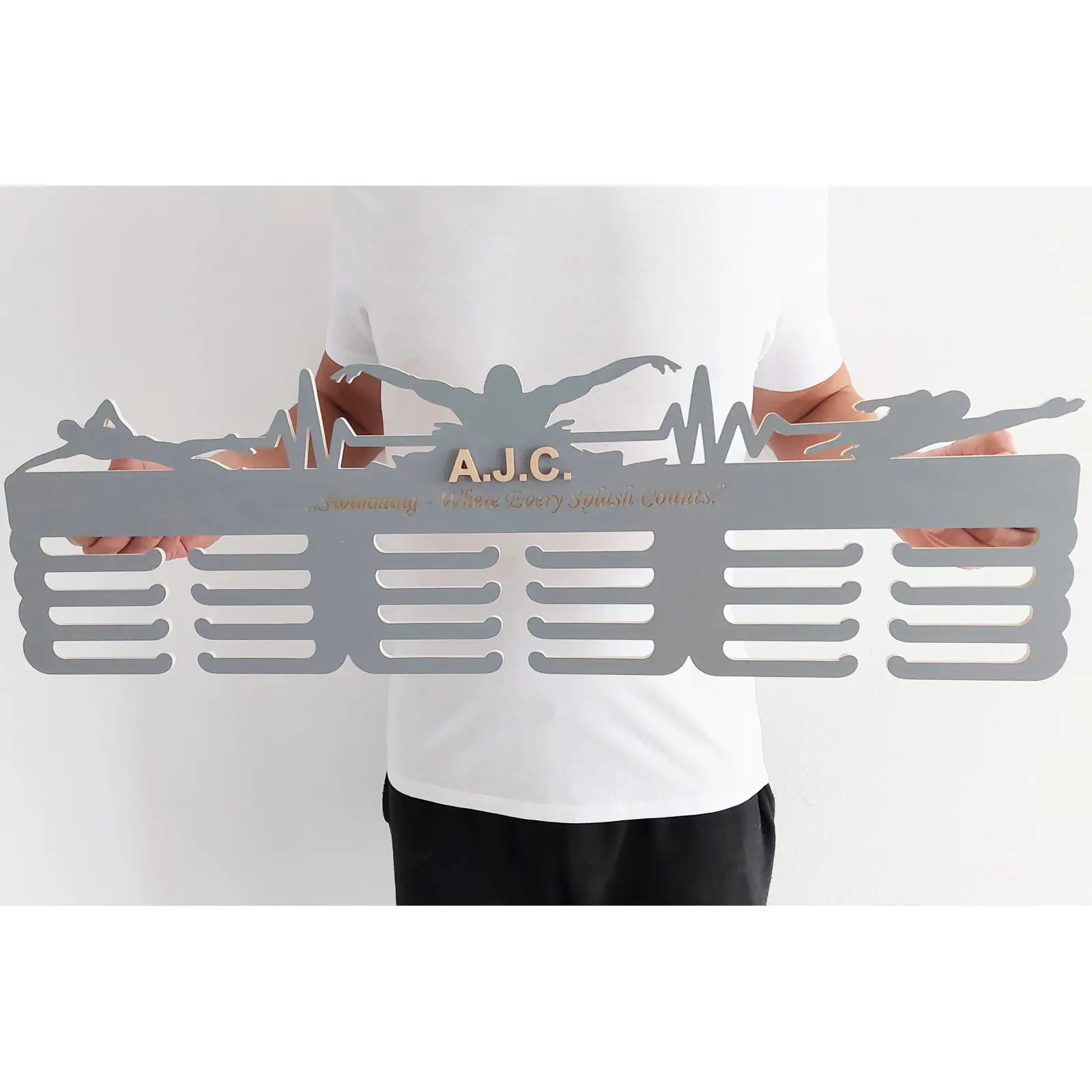 Drevený vešiak na medaily: Oslava plaveckých úspechov a srdcového rytmu