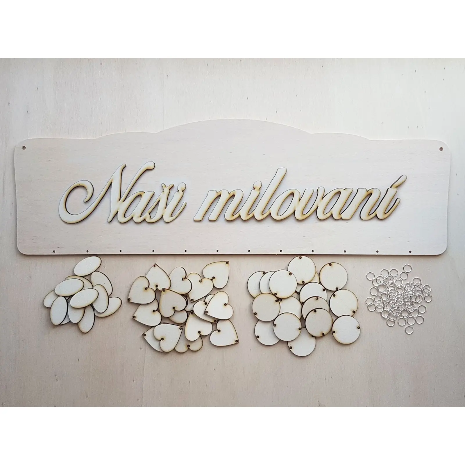 Obsah jedného balenia: 1x nápis 3D (nieje prilepený), 1x tabuľka, 18x srdiečko, 18x kruhov, 12x ovál, 60x krúžok pre spojenie (10 mm).