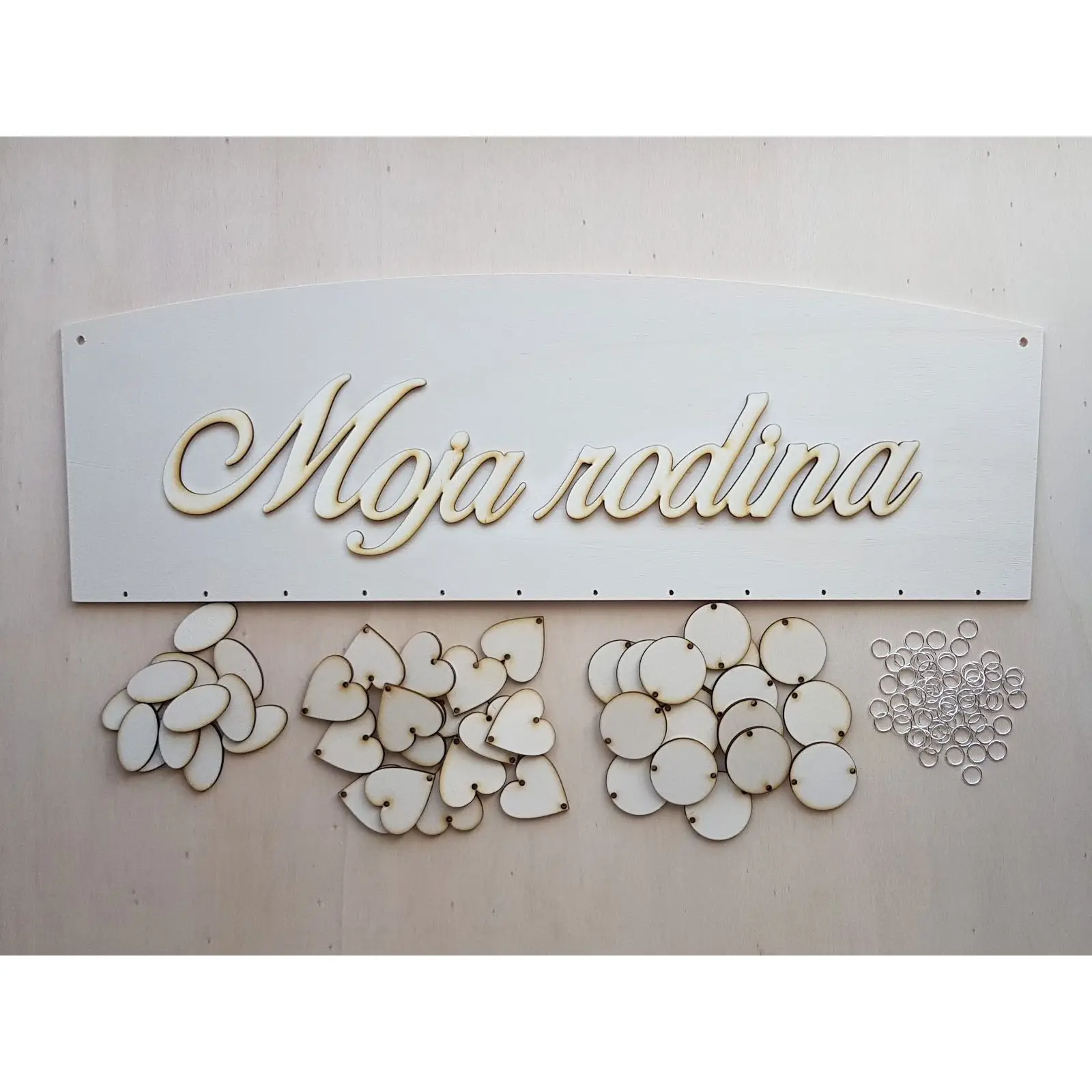 Obsah jedného balenia: 1x nápis 3D (nieje prilepený), 1x tabuľka, 18x srdiečko, 18x kruhov, 12x ovál, 60x krúžok pre spojenie (10 mm).